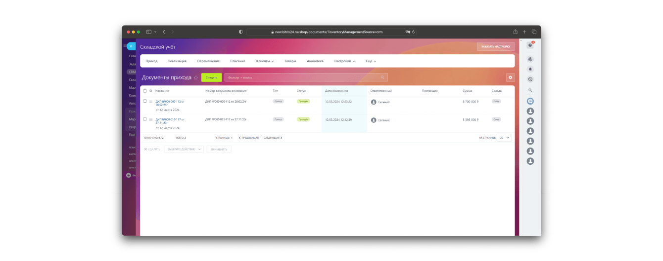 Внедрен складской учет с использованием типовой облачной системы Битрикс24, заведены товары, выполнены настройки для стандартных операций – приход, реализация, перемещение между складами, списание.