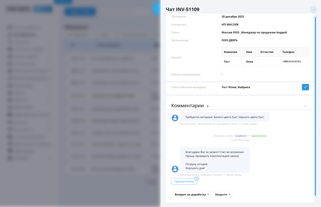 Для проверки работоспособности всех имеющихся заявок были добавлены тестовые профили дилеров и менеджеров фабрики, прикрепленные друг к другу.