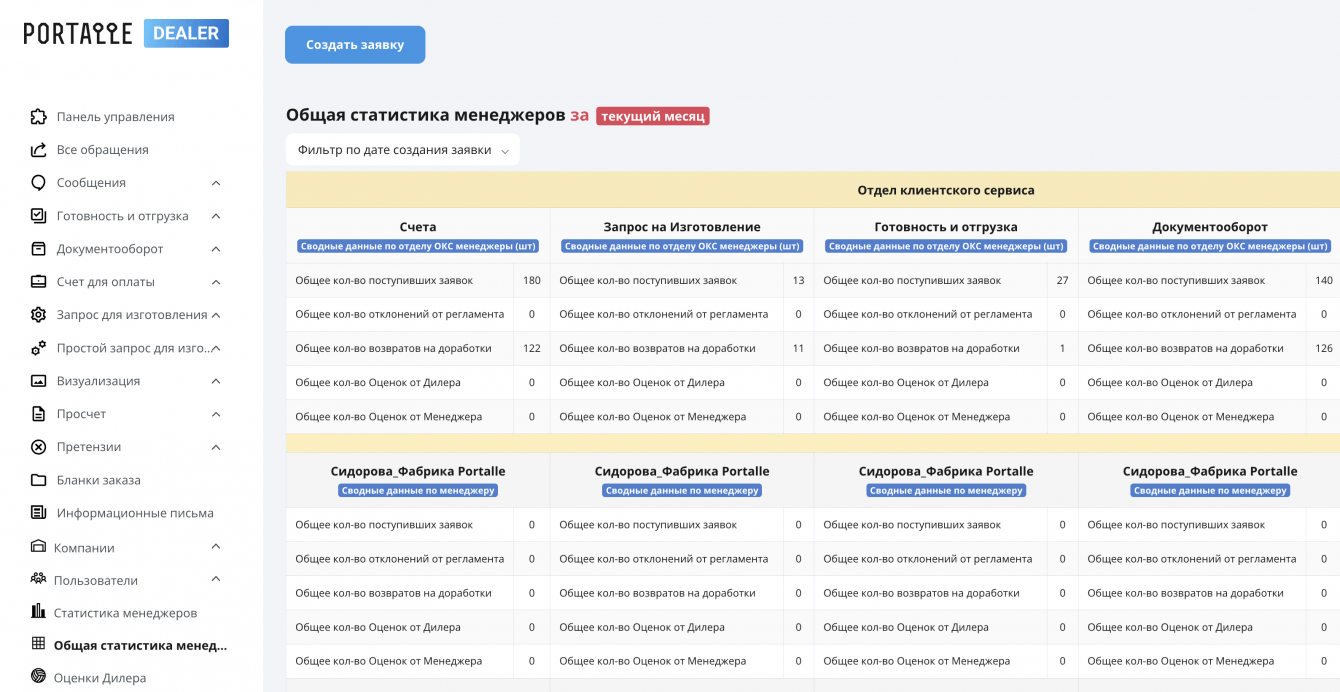Для анализа работы сотрудников вывели общую статистику и статистику по каждому менеджеру которая показывает общую выработку по заявкам.