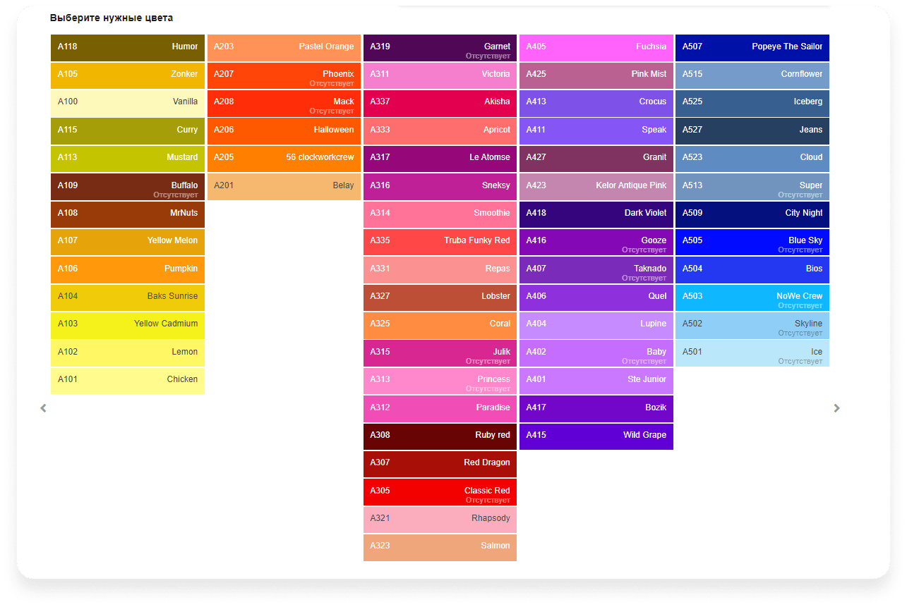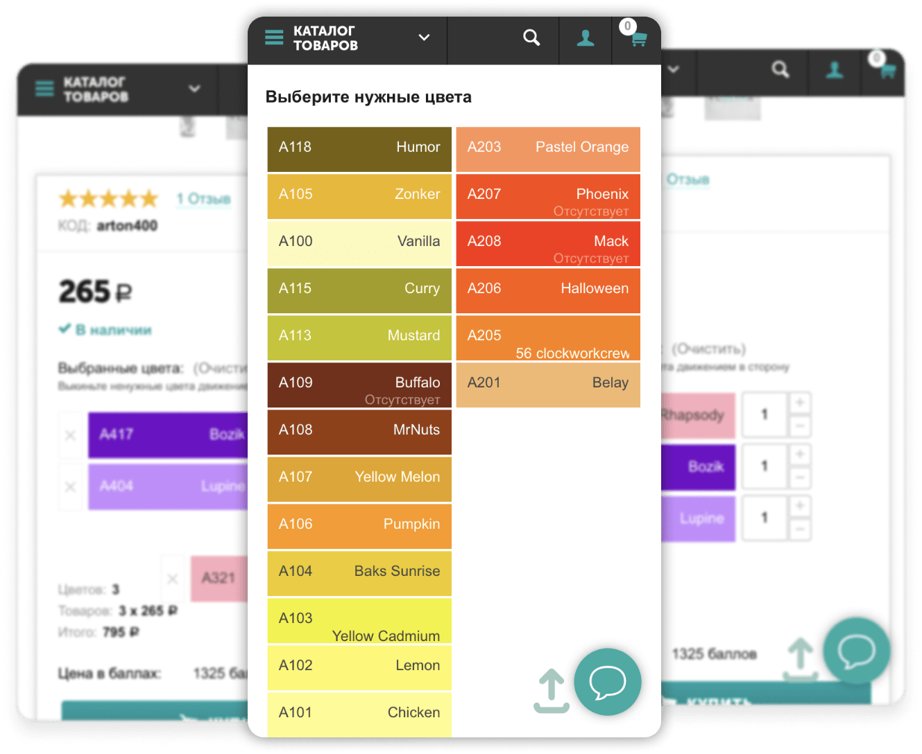 Мы предусмотрели этот момент в адаптивной верстке. Если пользователь заходит в интернет-магазин с мобильного — оттенки красок выстраиваются в столбцы, между которыми можно перемещаться свайпами. Нужный цвет выбирается одним кликом, добавляется к заказу в верхней части экрана. Чтобы удалить ненужный цвет, не приходится отжимать каждый из них, они удаляются также с помощью свайпа в любую сторону.