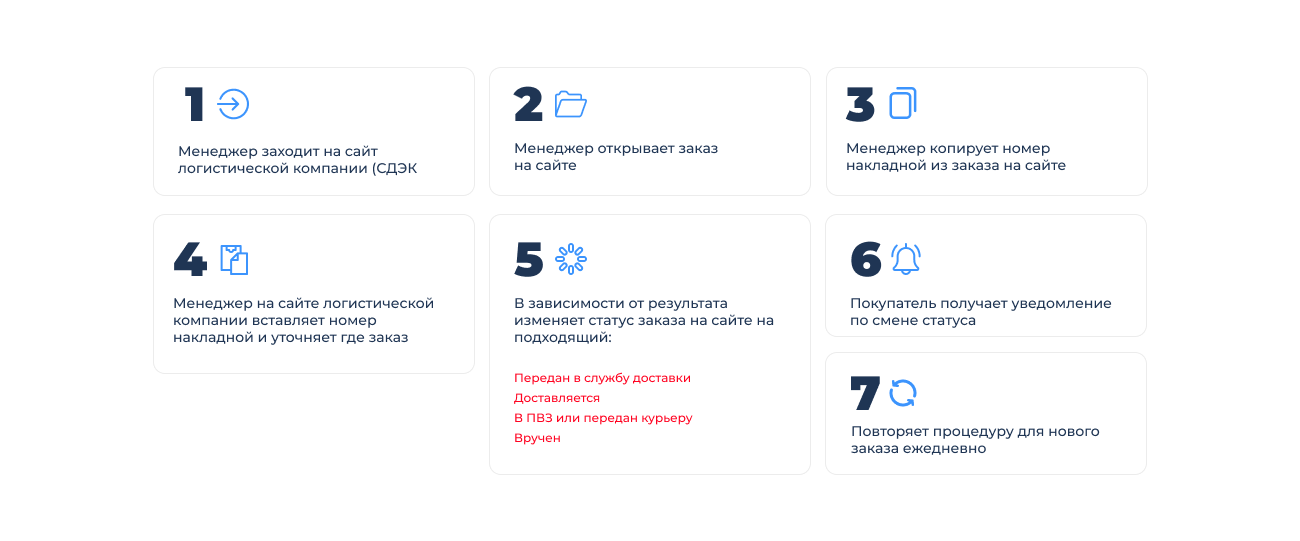 - Быстрая обработка заказов: автоматически и без ошибок.