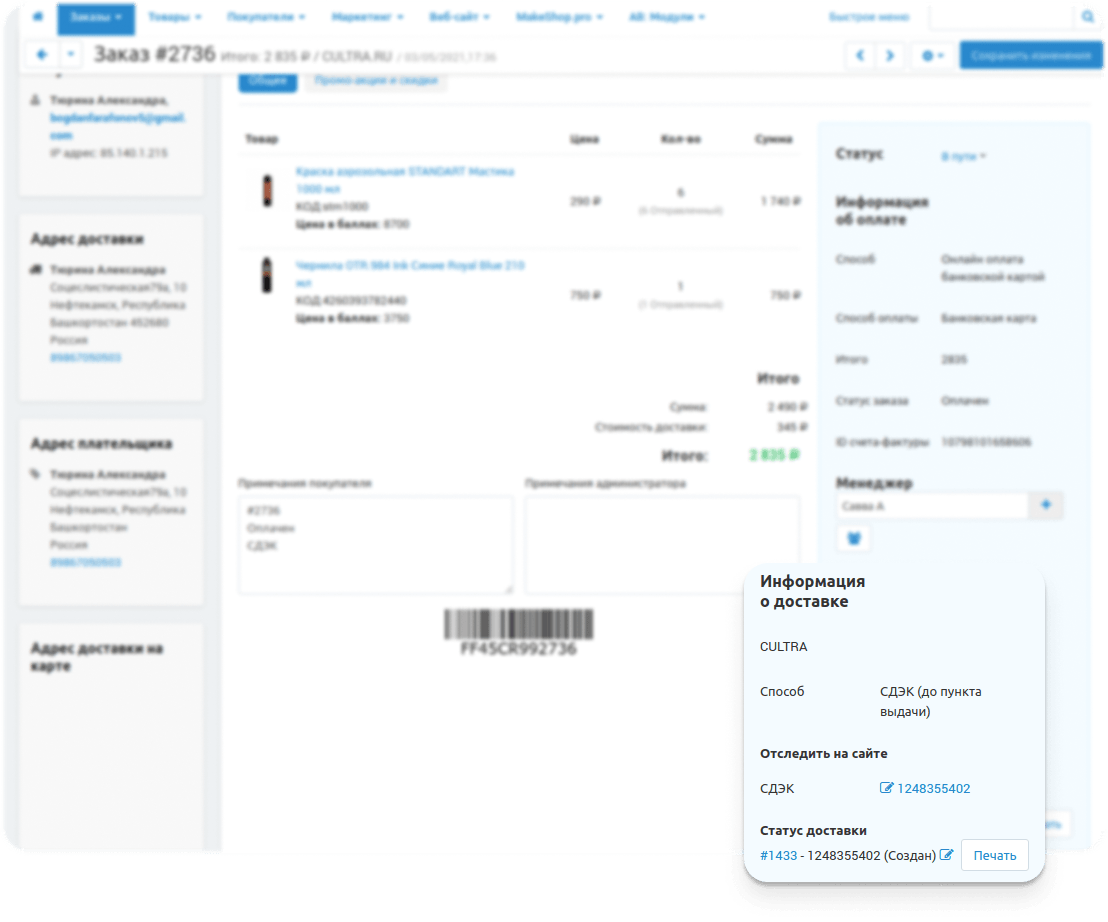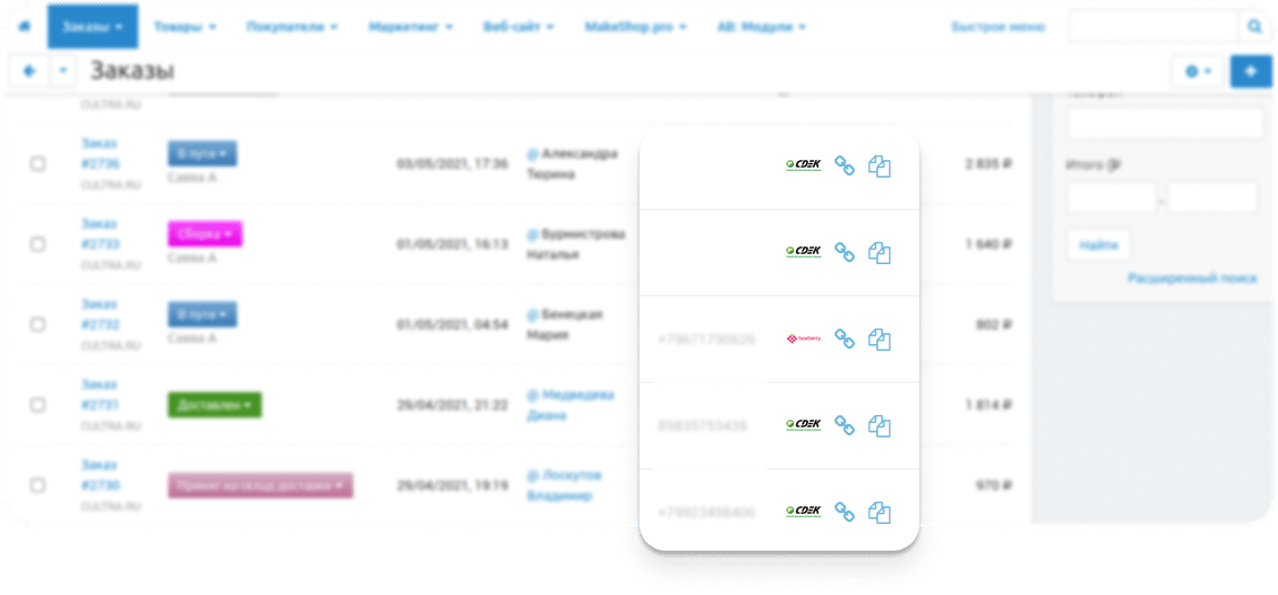 Для администратора мы также добавили удобную опцию: не заходя в заказ, он может скопировать трек-номер или перейти на сайт транспортной компании, где трек-номер уже будет заполнен. Там можно в один клик отследить местоположение заказа.