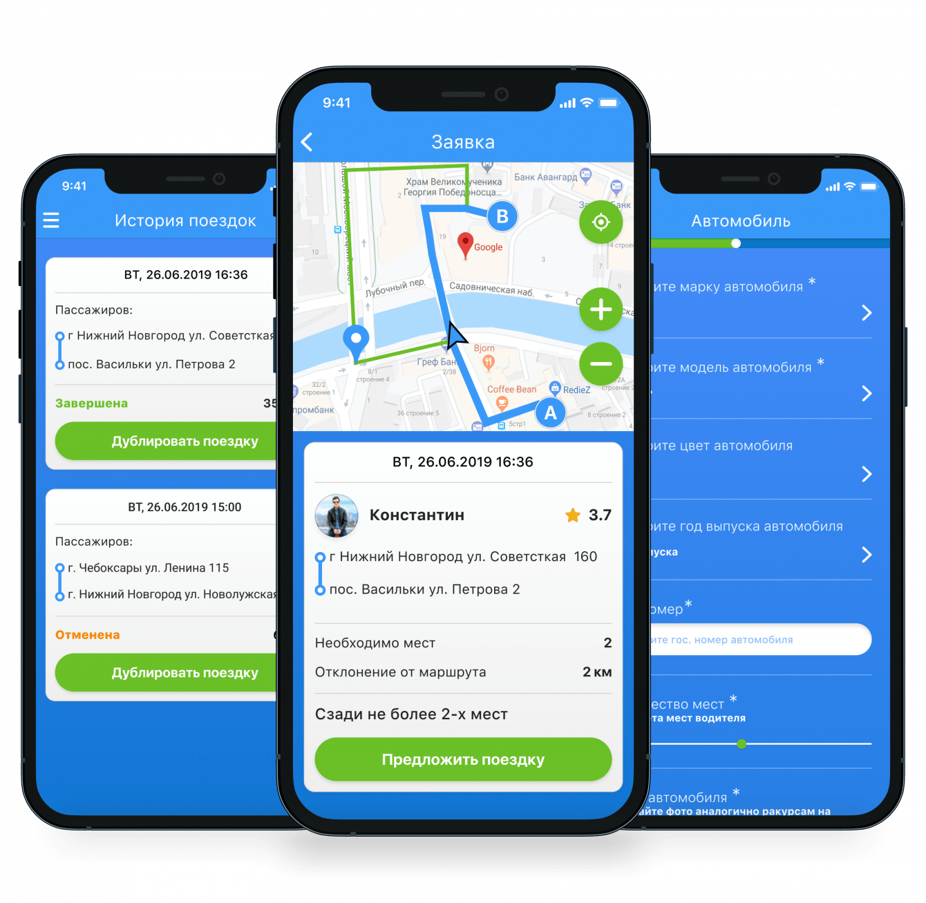 - Пассажир может опубликовать заявку на поездку (по городу, пригороду или межгороду) и найти подходящую поездку от Водителя;