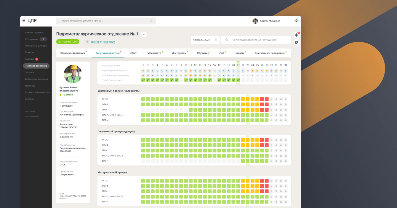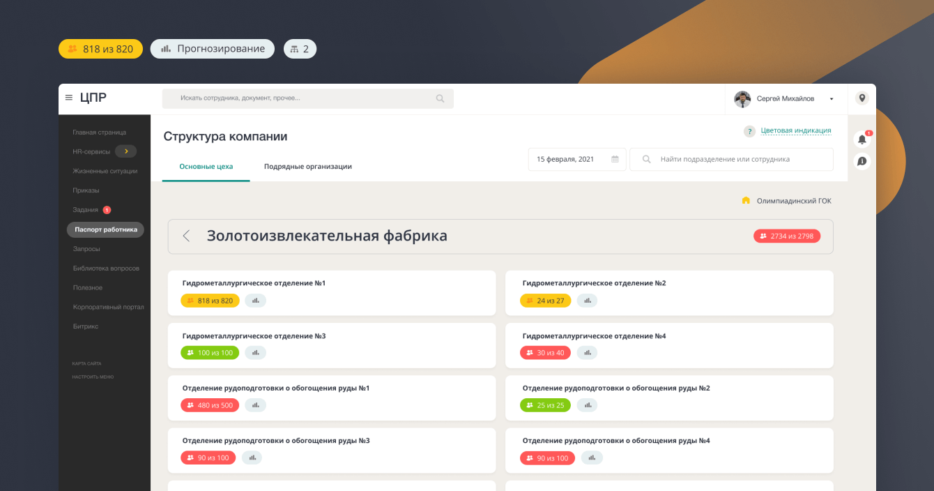 Так как прогнозирование — главная цель для этого проекта, мы свели данные о работнике со всеми его текущими и оперативными активностями и наложили на возможность просматривать загрузку подразделений (выход на место, карантинные мероприятия и т.д.). При этом для проекта был важен интуитивно понятный интерфейс с индикаторами. Например, численность подразделений подсвечена особым цветом.