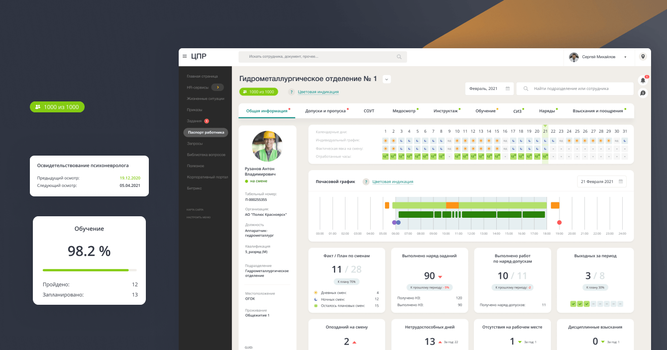 В рамках 1 релиза мы разработали прототип дашборда «Цифровой паспорт работника» на примере одного из подразделений компании. Это объемная подсистема, которая работает, как один из сервисов в рамках личного кабинета. При этом ЦПР объединяет данные, которые хранятся в разных системах заказчика.