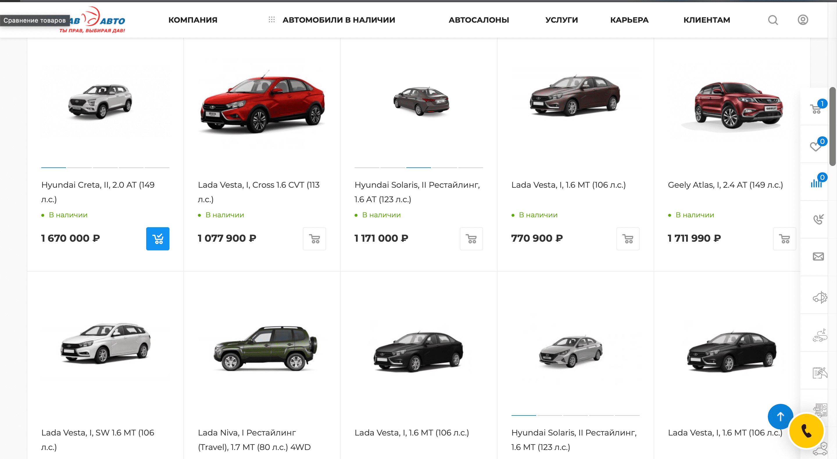 Всю протяженность главной страницы заполнили видимыми, но не навязчивым коммерческими элементами. Марки авто в каталоге оформили с кнопкой «Купить». Это нехарактерный для большинства автодилеров прием: добавлять машины в корзину, почти как одежду или продукты питания, мы решили по итогам нескольких экспериментов. Выяснилось, что такая возможность дает дополнительный рост конверсии. Не все пользователи хотят звонить или оставлять заявку на звонок.
