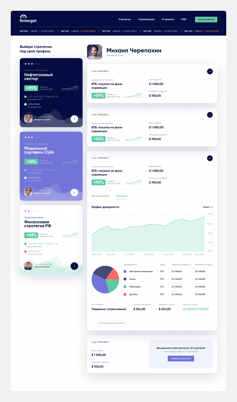 Итак, нам нужно спроектировать интерфейс финансового инструмента в современном стиле, основываясь на бренд-гайдлайнах продукта Fintarget. Сделать особый акцент на карточке стратегии — было важно сделать ее понятной даже человеку без опыта в инвестициях.