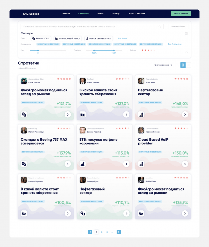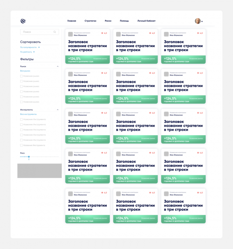 При разработке первой версии карточек инвестиционных стратегий мы ориентировались на текстовое ТЗ заказчика, но понимали, что «текстовое представление» может сильно не соответствовать визуальному результату. Вот что получилось: