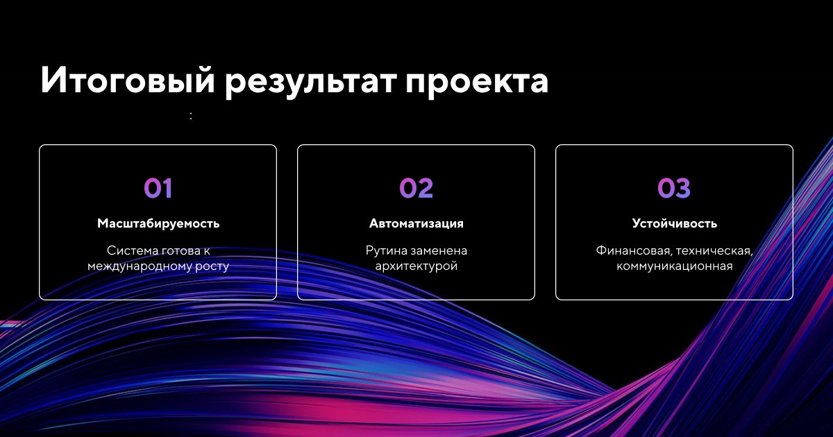 Мы усилили технический фундамент платформы: оптимизировали архитектуру, устранили узкие места, подготовили инфраструктуру к международным интеграциям и росту нагрузки.
