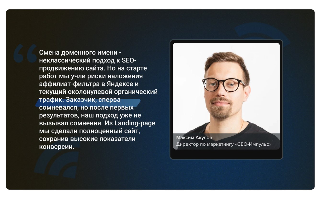 Кейс описывает продуманный подход к SEO-продвижению. Определяем точки роста, сразу устраняем возможные негативные последствия в будущем. Это я имею ввиду про аффилиат-фильтр. После чего создаем из одностраничного сайта полноценный сайт, который покрывает весь спектр услуг.