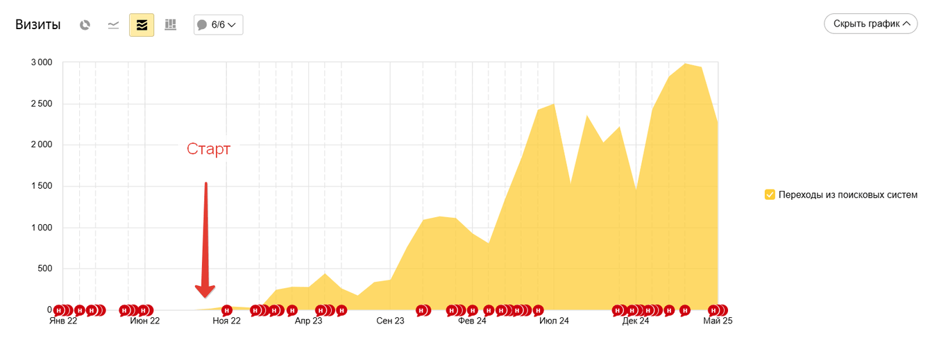 3. Далее мы добавили информационные статьи и через 3 года с момента старта сайт получает около 3 000 в месяц