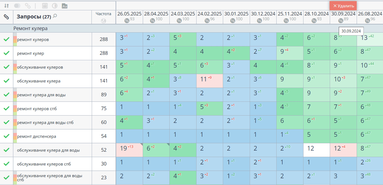 Мы собрали и проанализировали семантическое ядро, включающее десятки целевых поисковых запросов, связанных с ремонтом, обслуживанием, чисткой и санитарной обработкой кулеров, а также обслуживанием пурифайеров и заменой фильтров. В ядро вошли как высокочастотные, так и низкочастотные коммерческие ключи, имеющие поисковый спрос в Ленинградской области