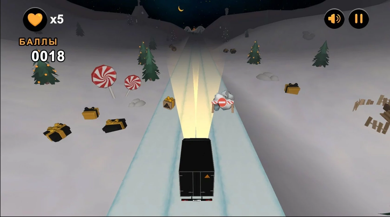 В новогодней игре «Дел Мороз» игрок управляет грузовиком праздничной доставки. Цель игроков, собрать максимальное количество посылок на трассе, избегая столкновения с препятствиями.