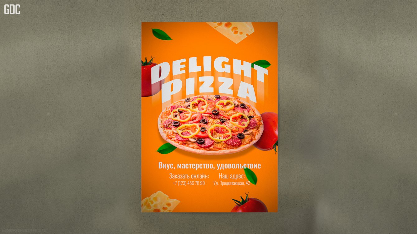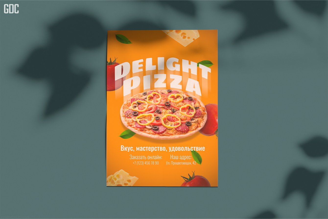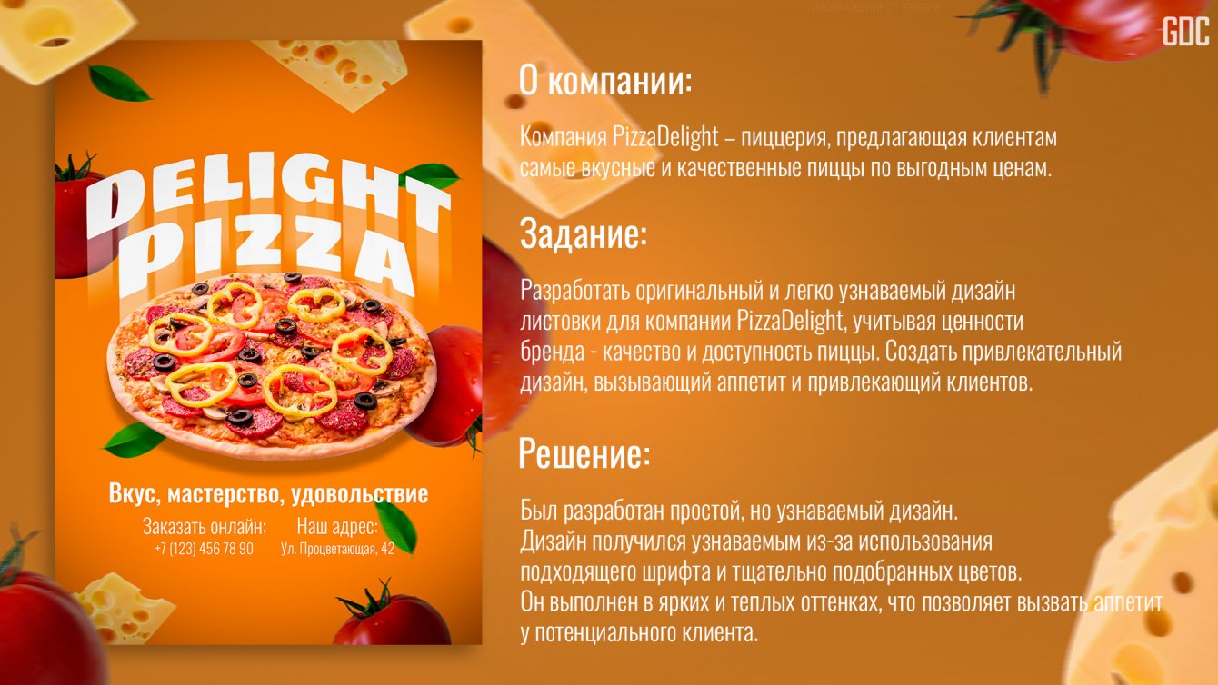 О компании: Компания PizzaDelight – пиццерия, предлагающая клиентам самые вкусные и качественные пиццы по выгодным ценам. Задание: Разработать оригинальный и легко узнаваемый дизайн листовки для компании PizzaDelight, учитывая ценности бренда - качество и доступность пиццы. Создать привлекательный дизайн, вызывающий аппетит и привлекающий клиентов