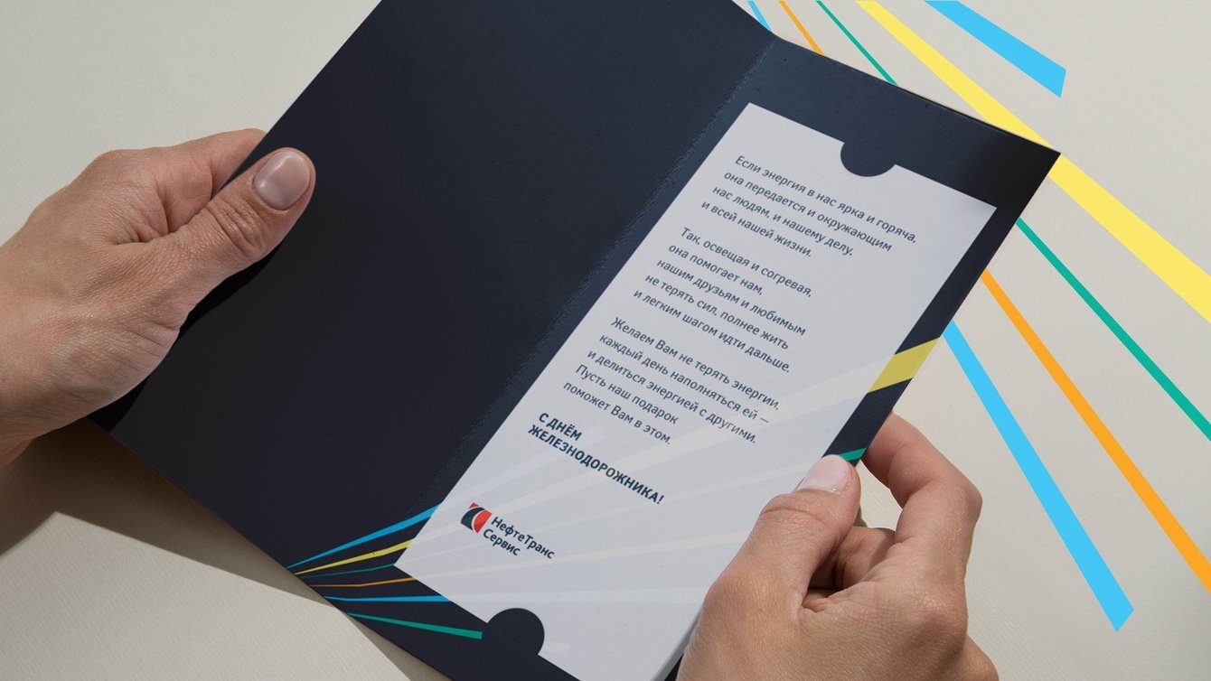 Мы дополнили посыл темой энергии, не менее отражающей сферу компании и концепцию подарка. В результате компания делится с адресатами светлой и теплой энергией. Эту суть и метафору мы передали в тексте-легенде, помещенном в поздравительную открытку.