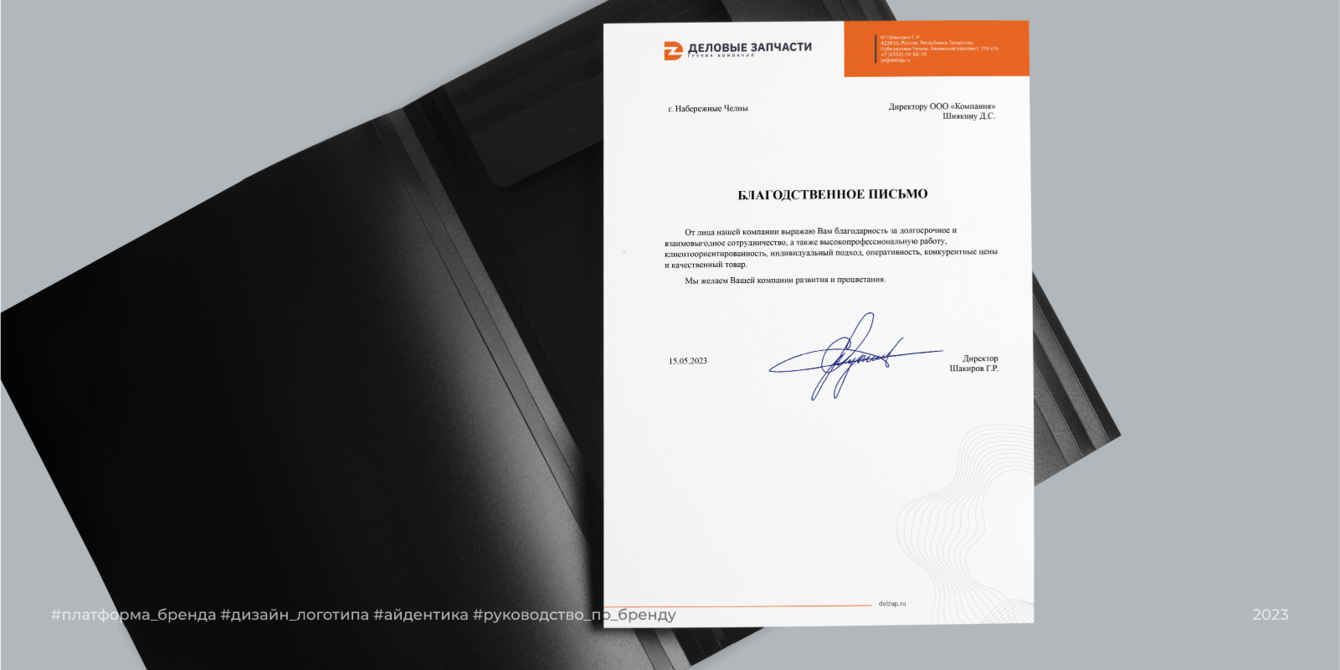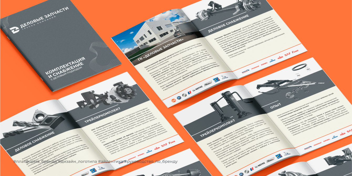 Создан единый стиль, гармонично сочетающий элементы всех дочерних компаний: название от «Деловые запчасти», цветовая палитра от «Трейлеркомплект», шрифтовое решение от «Деловое снабжение». Разработано руководство по позиционированию и использованию фирменного стиля.