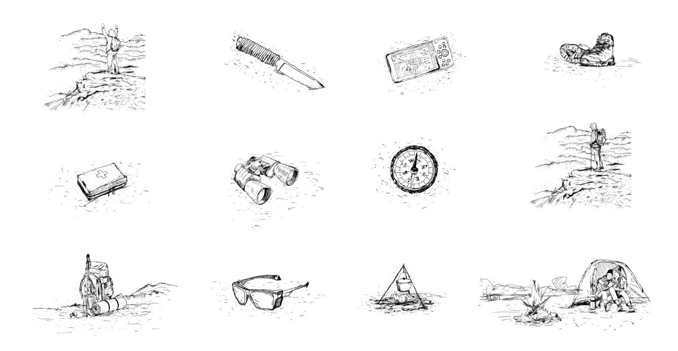 Всё по референсам и стильно, в соответствии с пожеланиями заказчика. Но хотелось чего-то большего. Поэтому мы предложили альтернативу: нарисованные от руки иллюстрации на главной странице, словно из скетчбука путешественника — горы, вечера у костра, элементы походной экипировки.