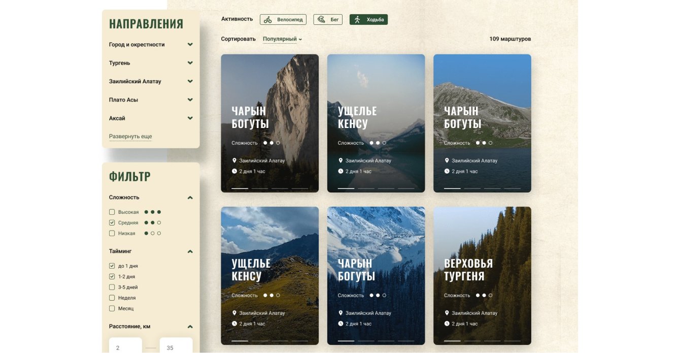 Основная идея проекта — показать, что ходить в походы может каждый независимо от возраста и физической подготовки. Поэтому мы продумали разбивку маршрутов в фильтре по уровню сложности, активности, продолжительности, высоте подъема, сезону и даже по достопримечательностям. В один маршрутах можно посмотреть горы, в других — водопады, в третьих — озера.