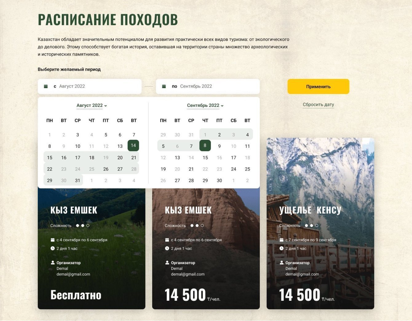 Кроме этого на сайте есть раздел с походами: это предложения от самого заказчика и в перспективе — от гидов, которые присоединятся к сервису. Поход можно выбрать из списка актуальных на определенные даты, для этого предусмотрен фильтр.