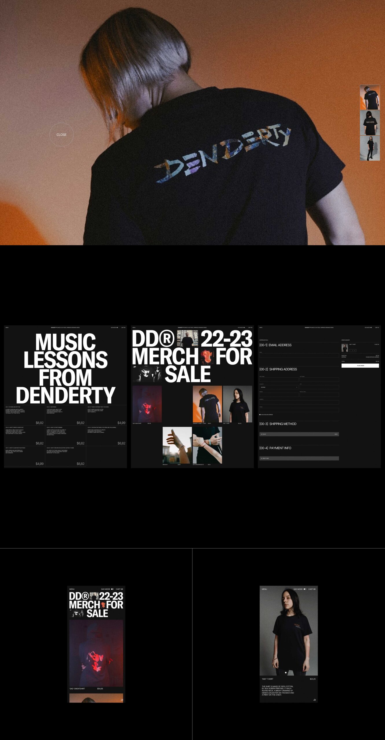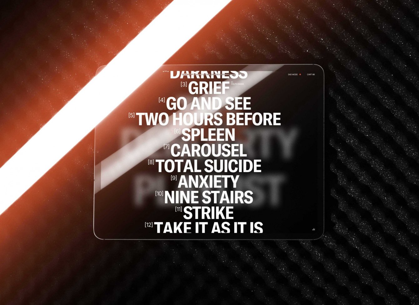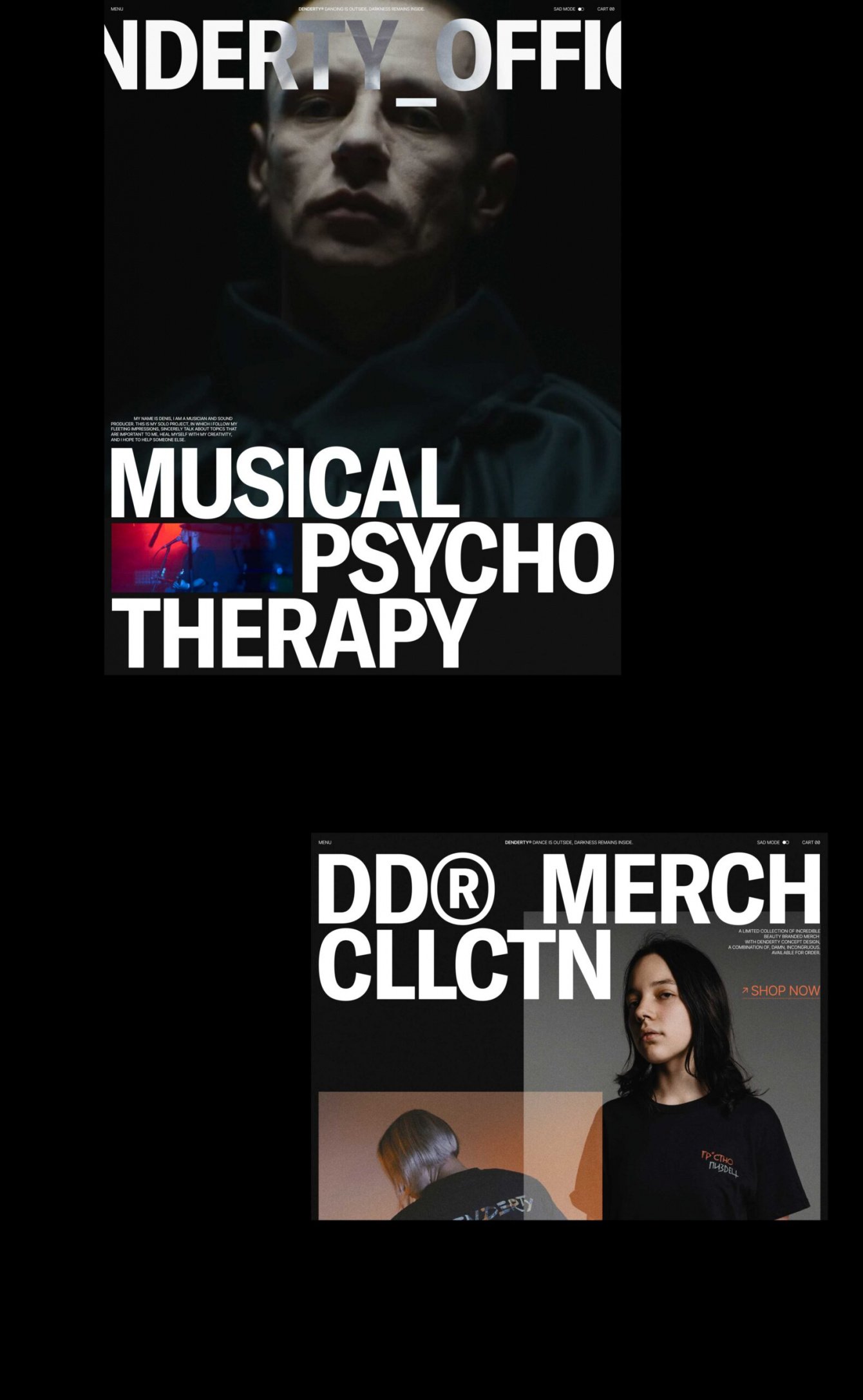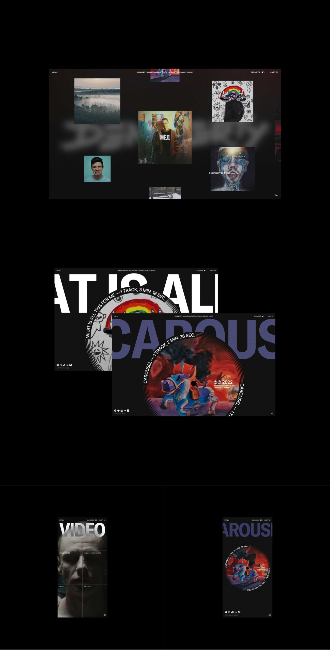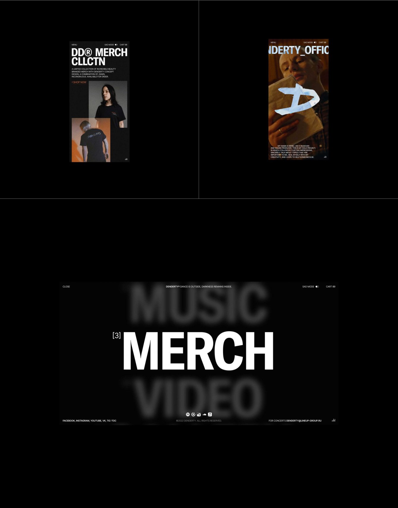 Самая крутая фишка на всем сайте – “sad mode”. При переключении на него все изображения и видео отображаются в duotone гранжевой стилистике, а также появляются акцидентные подписи, отсылающие к логотипу исполнителя. Этот режим концептуально перекликается с творчеством Denderty, а название отсылает к его самой популярной песне.