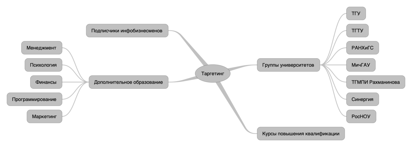 Начали мы с сбора аудиторий. Большую часть аудитории было легко найти через рекламный кабинет, однако это не дало бы полноценного эффекта и мы начали собирать и парсить аудитории по заданным параметрам из всех сообществ, которые могли бы нам помочь. Таким образом мы смогли собрать 16 аудиторных сегментов.
