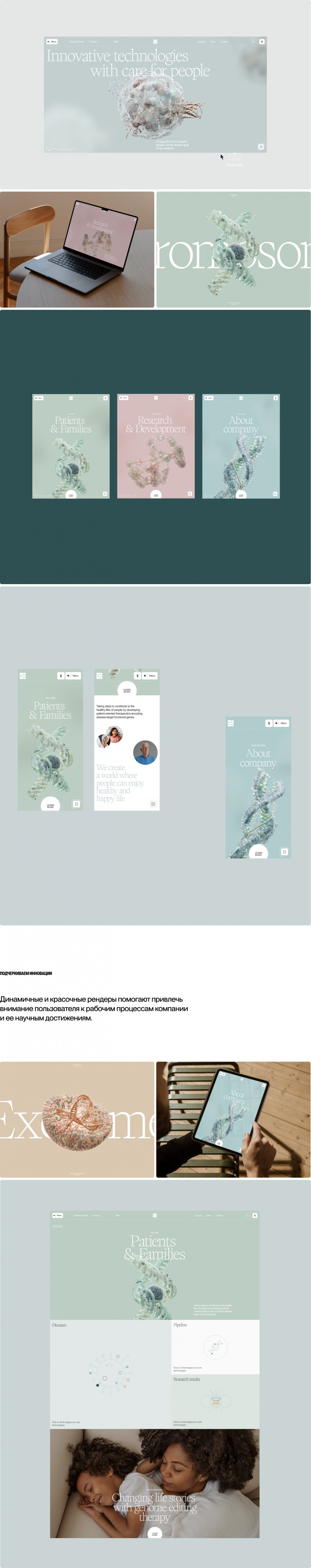 Для того чтобы подчеркнуть высокий уровень компетенции компании в области исследований биотехнологий мы решили оригинально визуализировать молекулу, стволовые клетки, хромосомы, экзосомы и днк на сайте. Динамичные и красочные рендеры помогают привлечь внимание пользователя к рабочим процессам компании и ее научным достижениям.