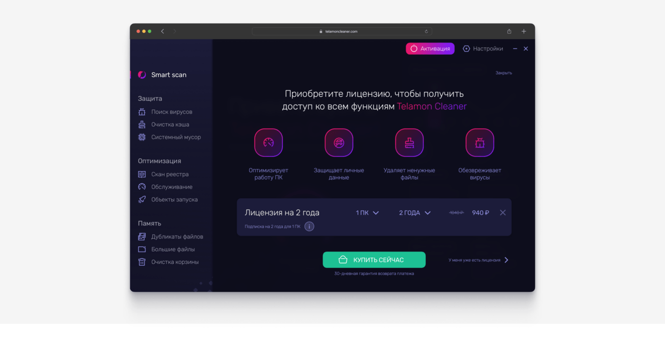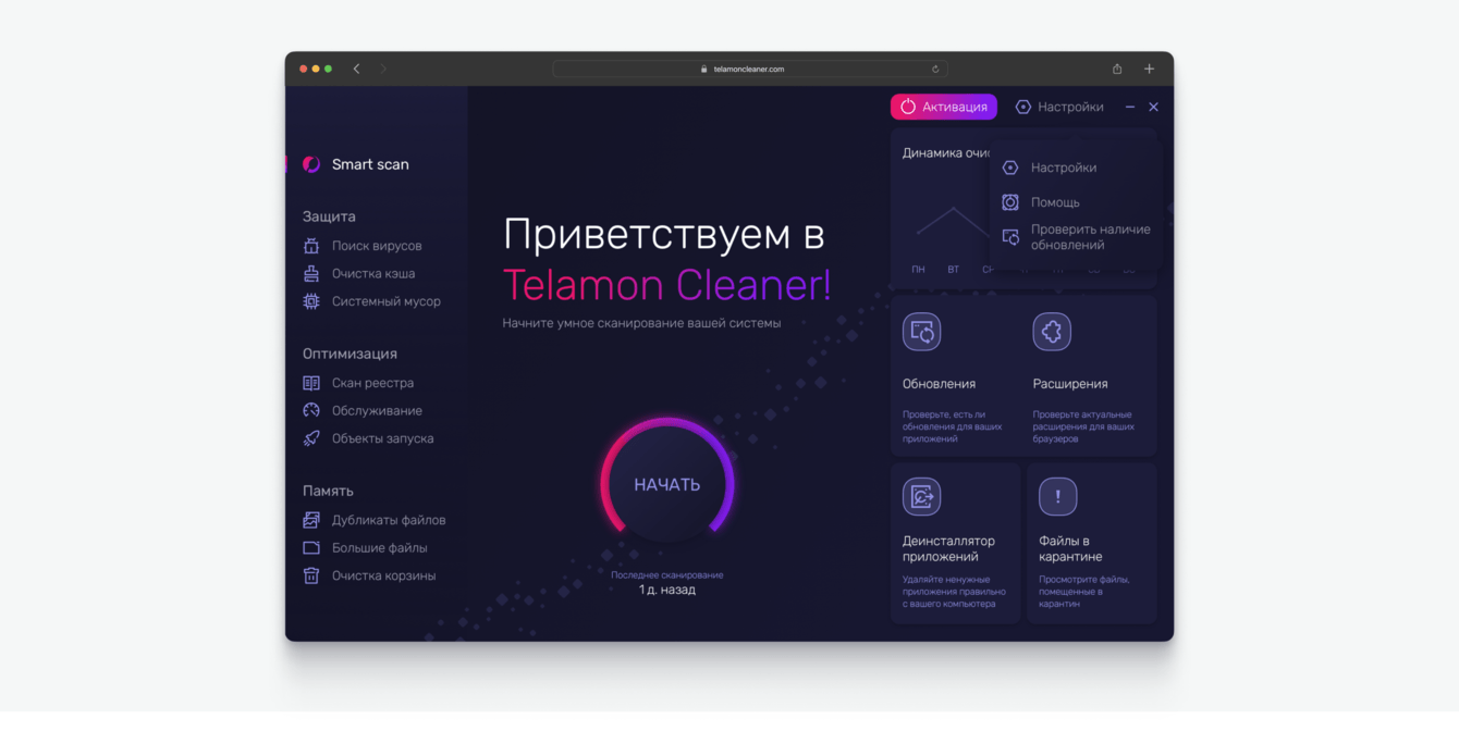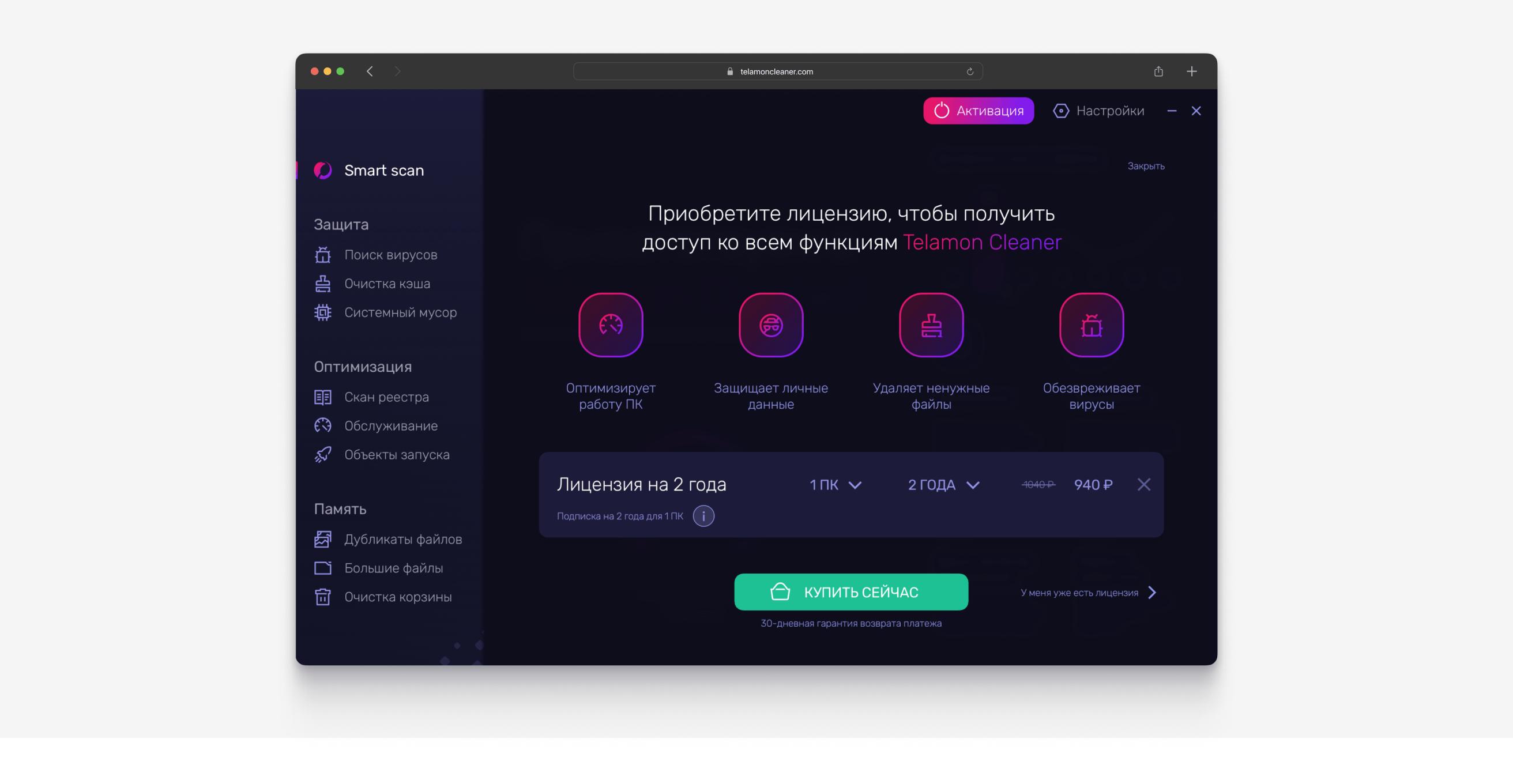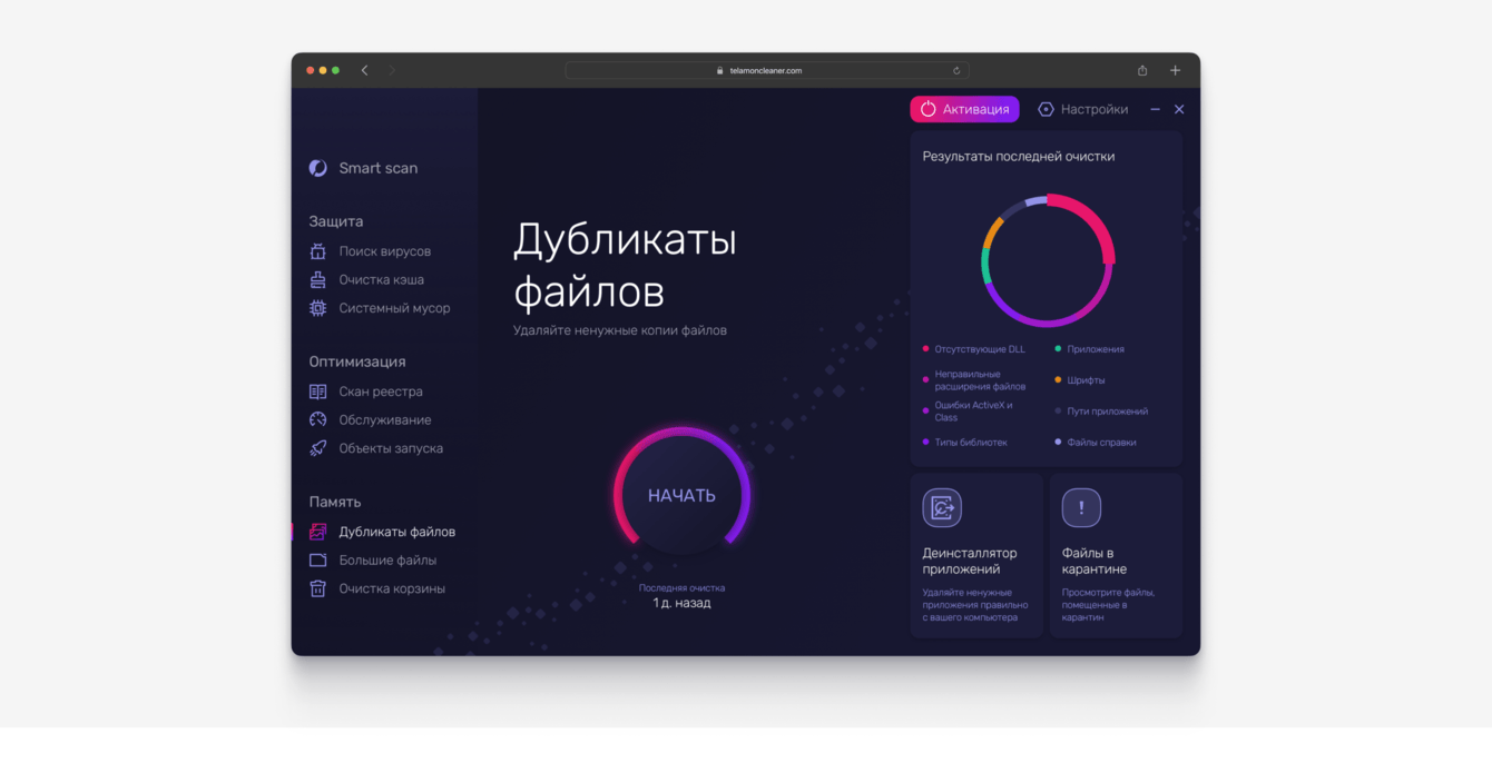 Telamon Cleaner — это быстрое и удобное средство для защиты и оптимизации работы Вашего компьютера на базе ОС Windows. Сервис проводит самые важные проверки компьютера и предоставляет информацию о найденных вирусах и вредоносном ПО, поврежденных записях реестра, количестве системного мусора и больших файлах, засоряющих жесткий диск.