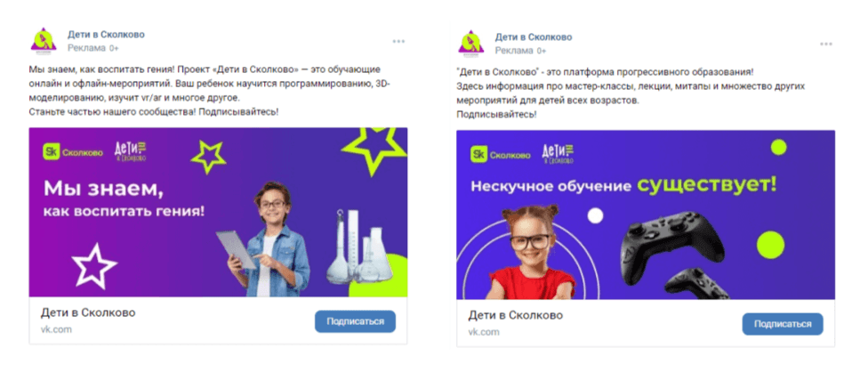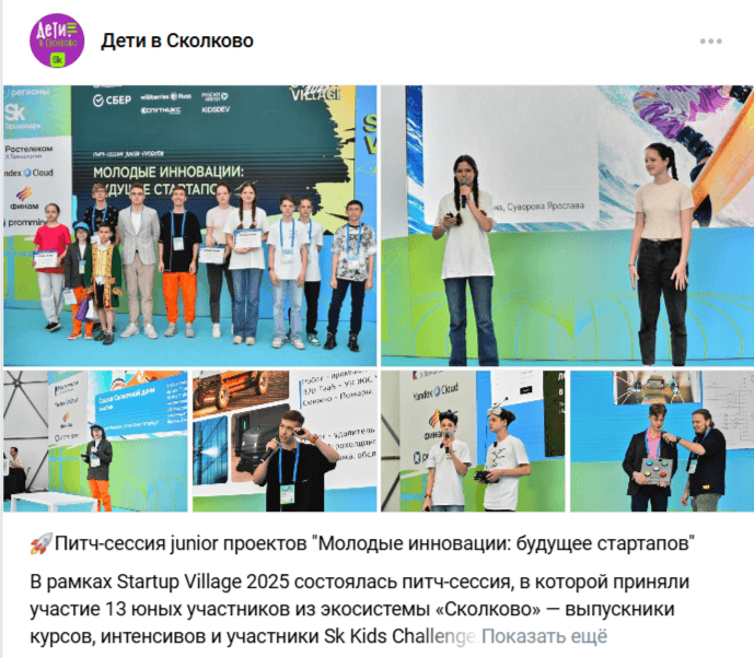 Сменили креативную концепцию — оставили однотонные имиджи с текстом «Дети в Сколково», используем максимум живых фотографий и видео с мероприятий.