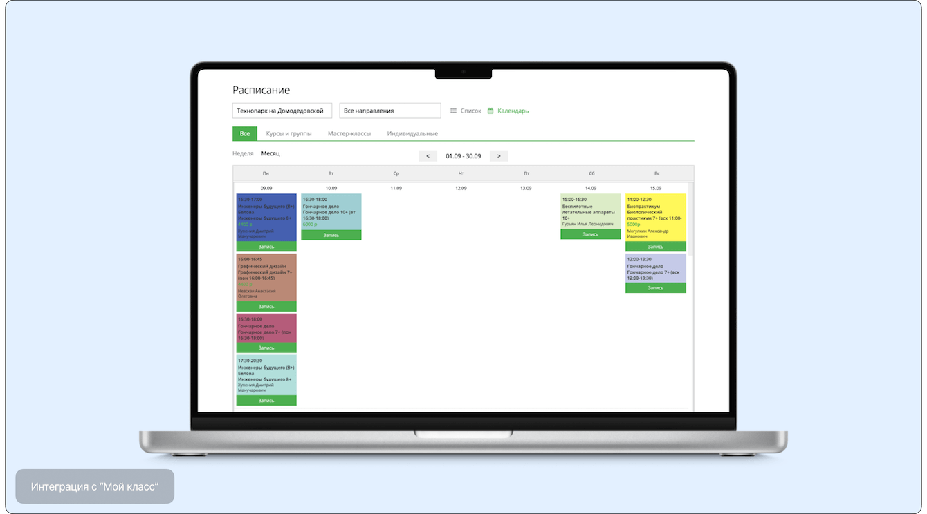«Мой класс» — это специализированная CRM для школ и детских центров, используемая нашим заказчиком. Мы настроили интеграцию с CRM на сайте, чтобы отображать актуальное расписание курсов и занятий через виджет. Также настроили автоматическую передачу заявок с форм записи на курсы в CRM.