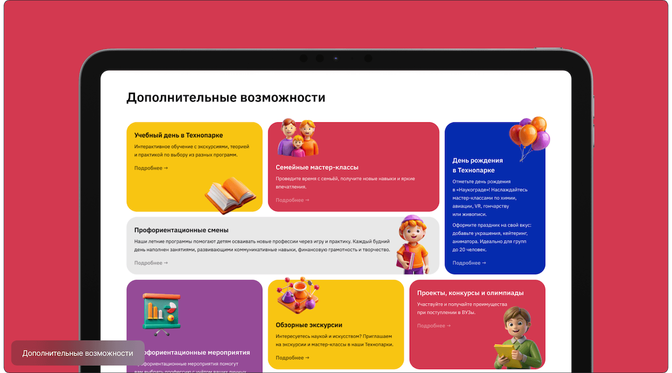 Раздел в прежней версии сайта состоял из 9 пунктов выпадающего меню, что было крайне неудобно с точки зрения поиска информации и навигации. Для реализации этого блока мы использовали приём Bento Grid. Каждый элемент интерфейса представляет собой отдельный модуль, который можно использовать повторно и независимо от других. Модули можно легко перемещать, изменять их размеры и конфигурации, что позволяет адаптировать интерфейс под разные нужды заказчика.