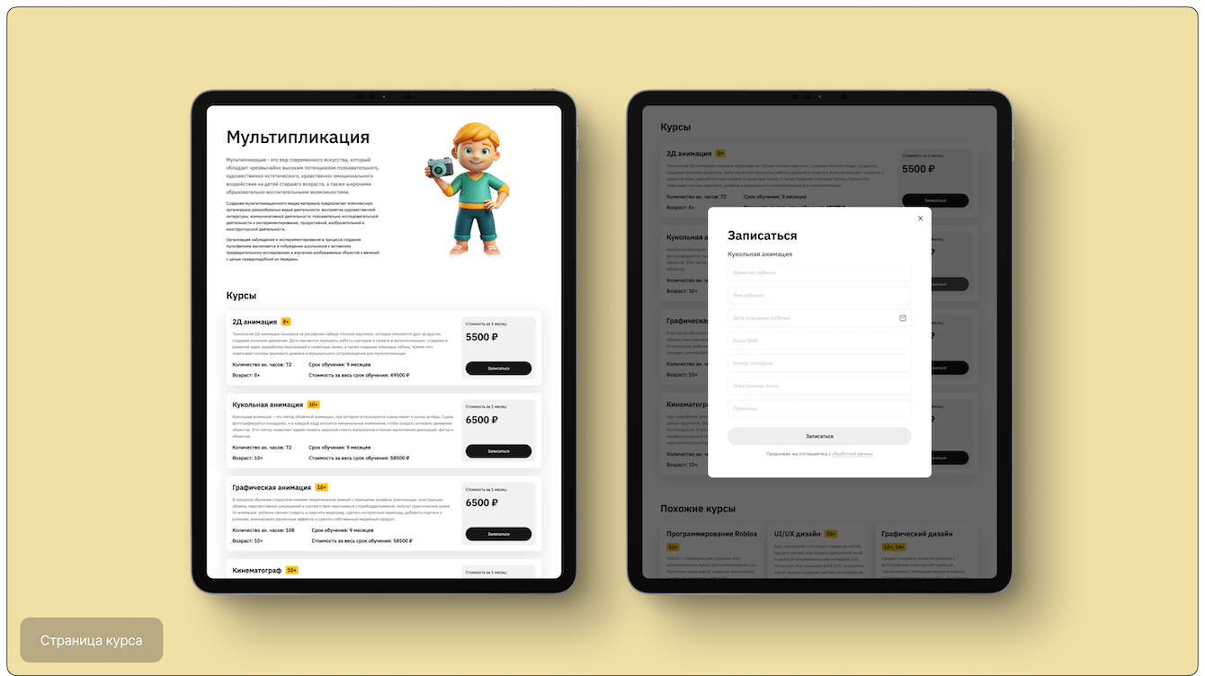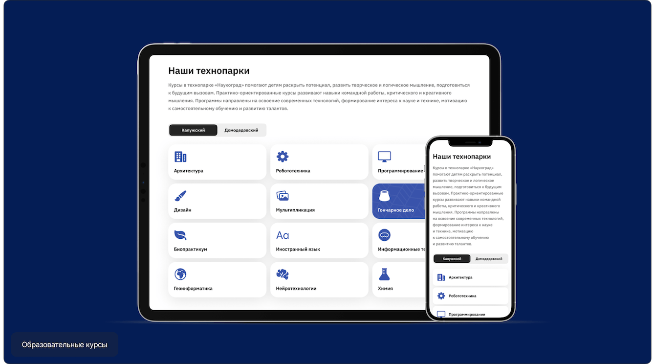 Мы переработали этот раздел: добавили переключатель между филиалами и разделили курсы по направлениям (архитектура, робототехника, программирование и т.д.). Теперь курсы отображаются в виде плиток, на которых указаны краткое описание, возрастные ограничения, количество часов, сроки и стоимость обучения. Также добавили кнопку для записи на выбранный курс. Благодаря этому детальные страницы курсов стали не нужны, и мы их убрали. После основного курса отображается блок «Похожие курсы».
