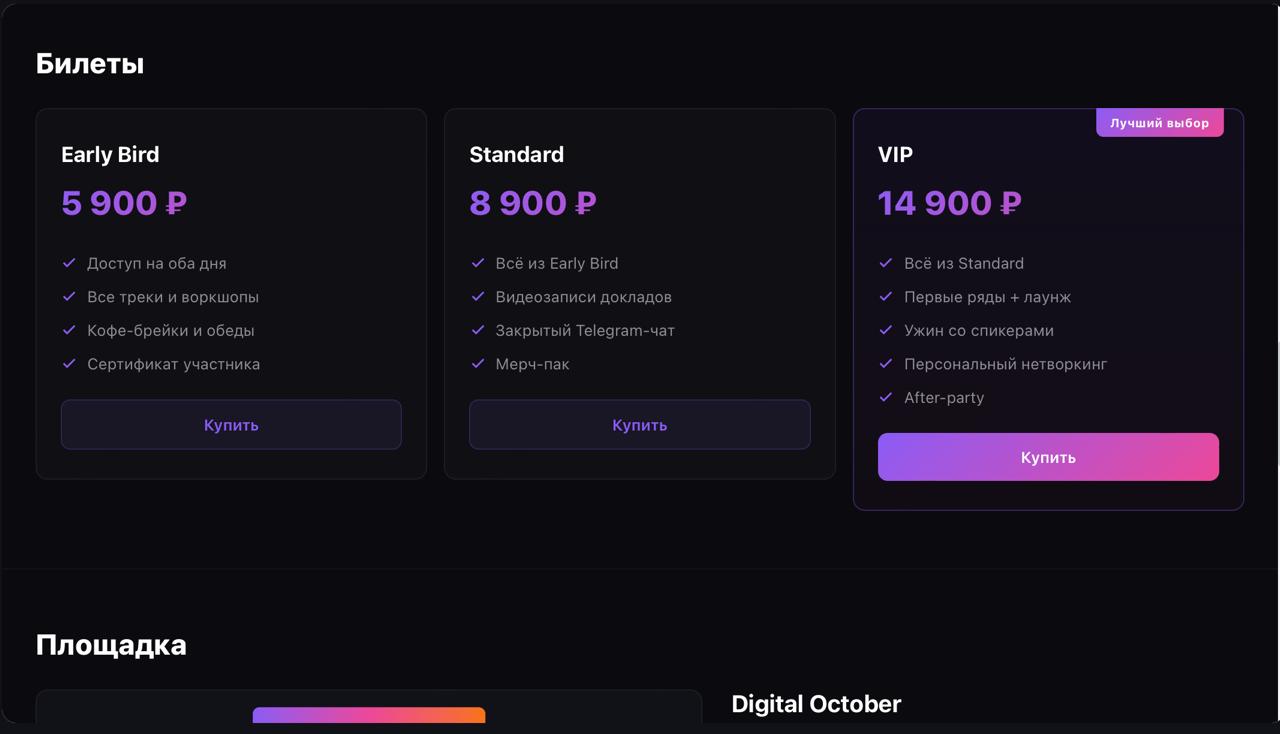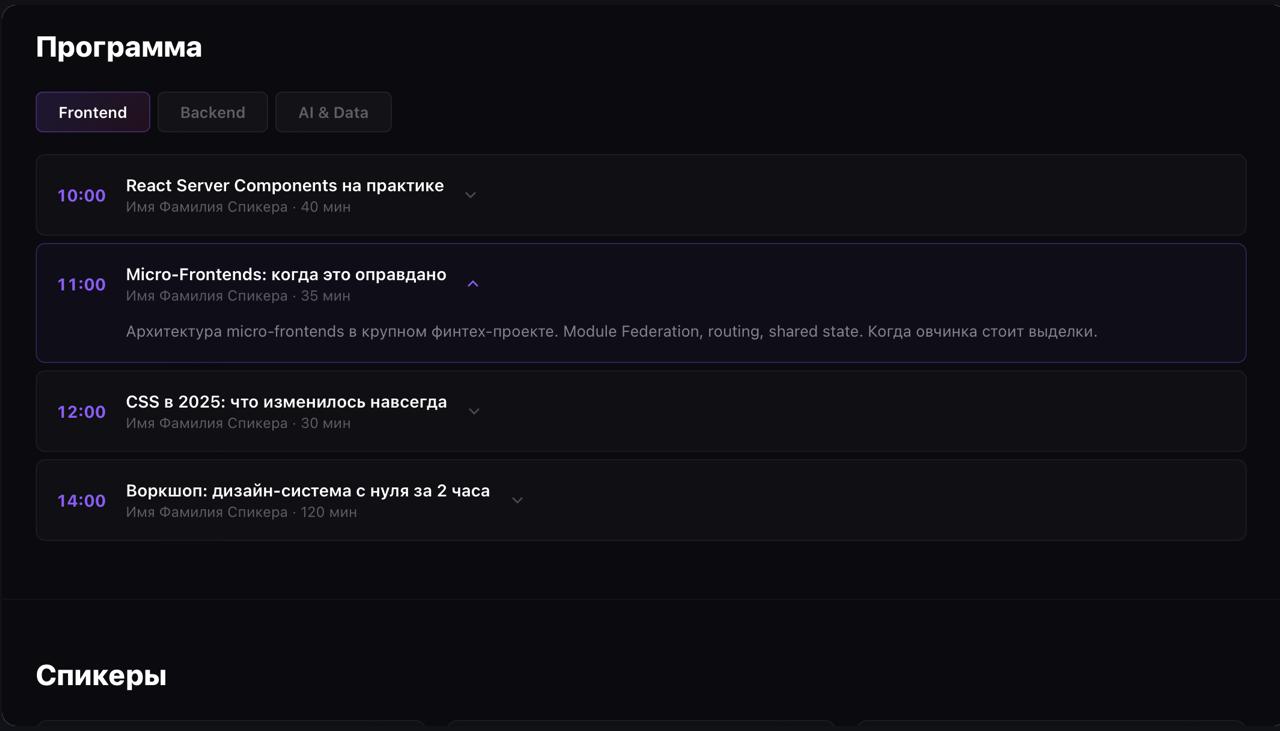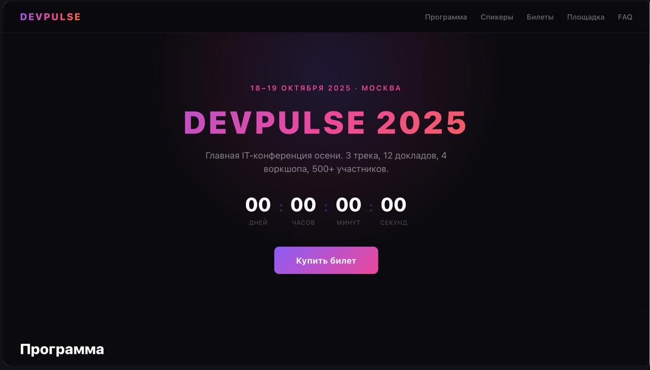 Задача: разработать промо-лендинг конференции с countdown, программой по трекам, блоком спикеров и покупкой билетов.