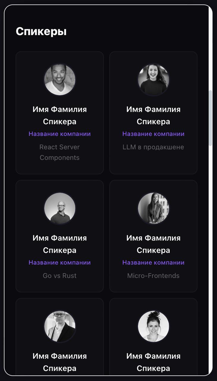 • добавить блок спикеров с карточками, темами выступлений и краткой информацией
