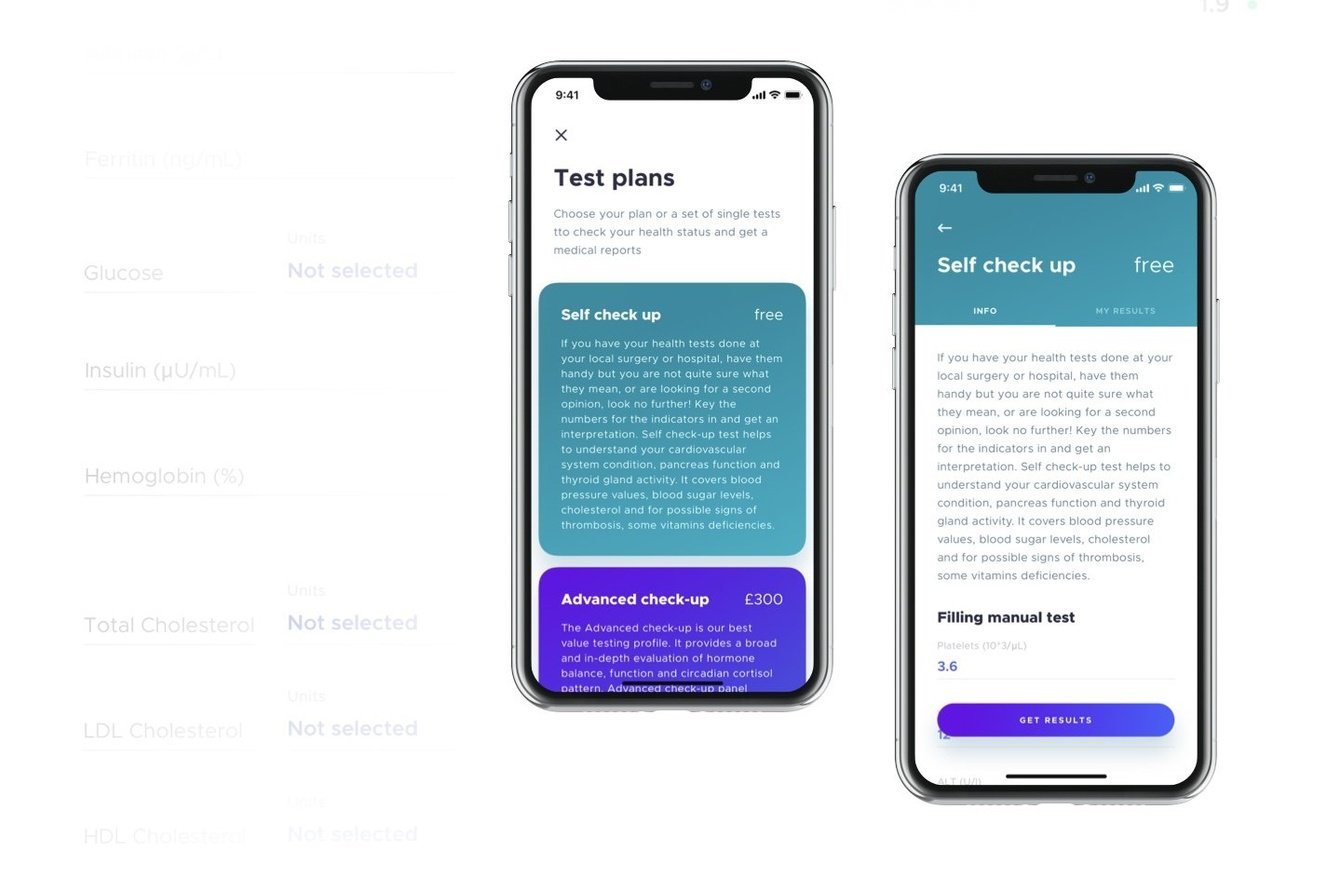 Создать приложение для заказа медицинских тестов на дом, получения отчетов о результатах анализов и статусе здоровья в приложении. Для клиента важно было сделать эту систему гибкой, чтобы дополнять скрининг организма различными исследованиями.