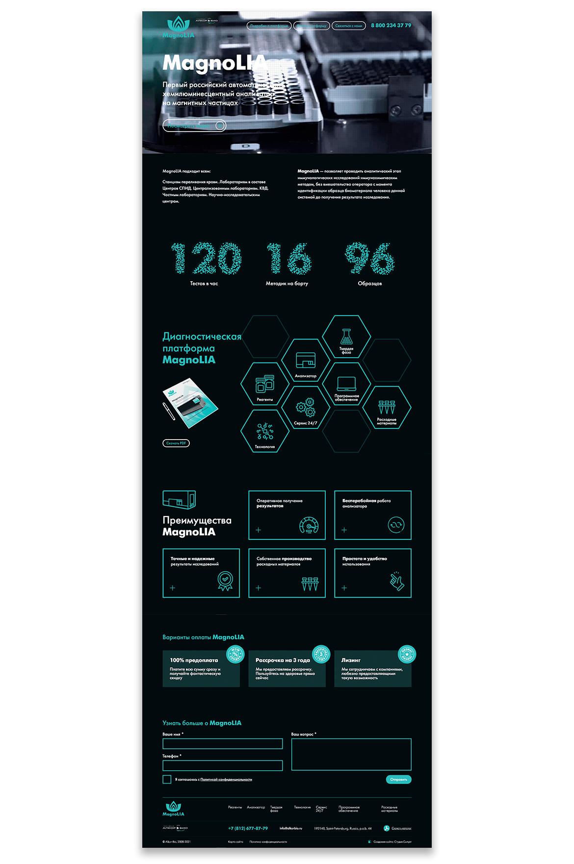 Разработка продуктового лэндинга для платформы иммунологических исследований MagnoLIA стала вторым проектом, выполненным нашей студией для компании «Алкор Био». Основной целью разработки была всесторонняя презентация возможностей и преимуществ продукта, выполненная «без воды» в лаконичном формате одностраничного сайта.