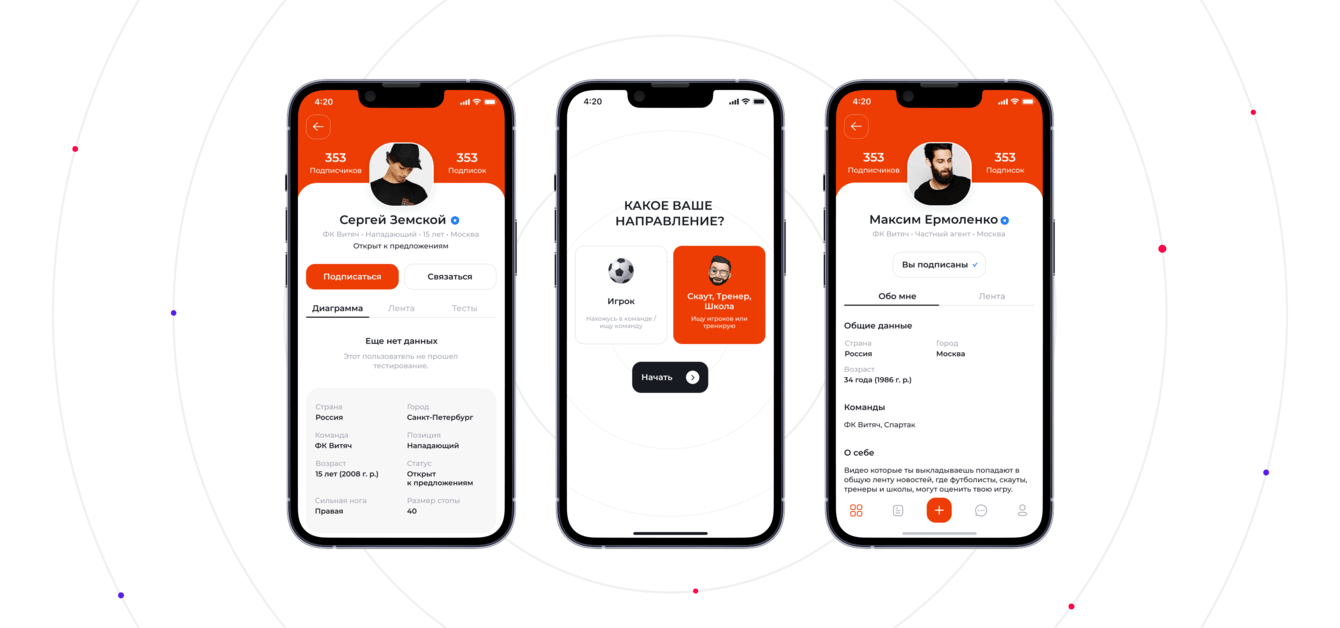 Задача: разработать мобильное приложение для юных футболистов и скаутов, посредством которого они смогут удобно коммуницировать. Функционал должен давать игрокам возможность показать свои навыки для получения приглашений от скаутов, а скаутам — получить быструю и полную информацию о игроке.