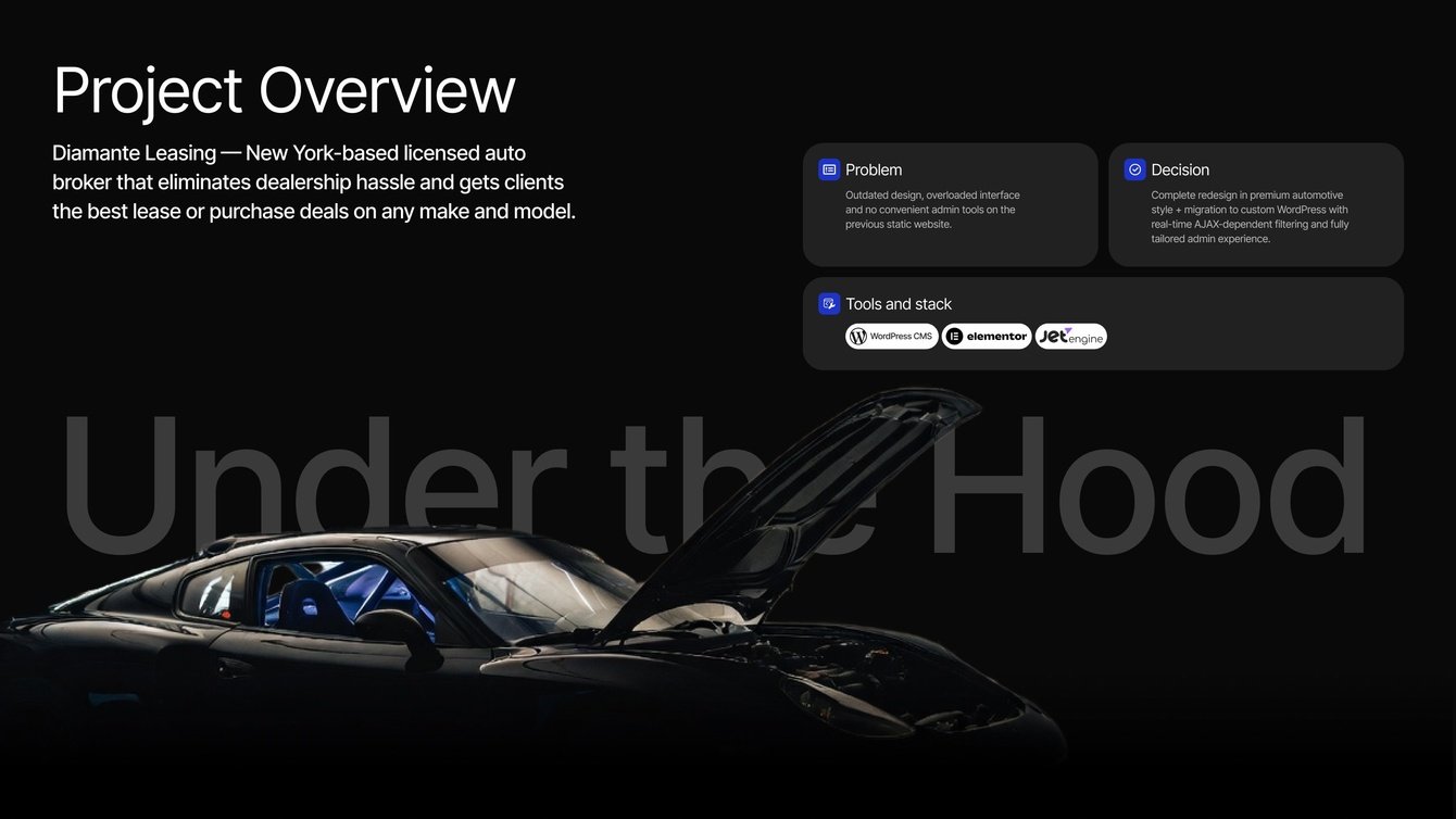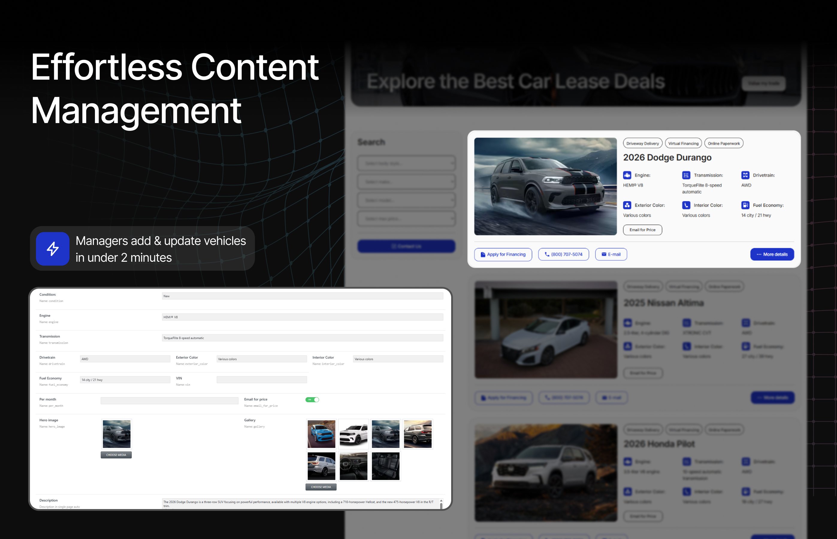 Добавил возможность добавления новых автомобилей через панель управления WordPress, без вмешательства в дизайн. При помощи кастомных полей, которые привязаны к определенным элементам в дизайне.