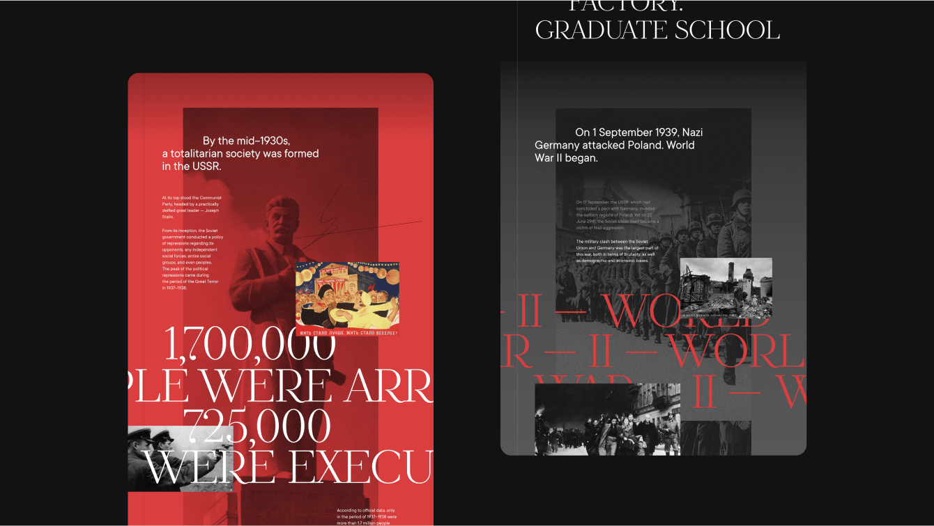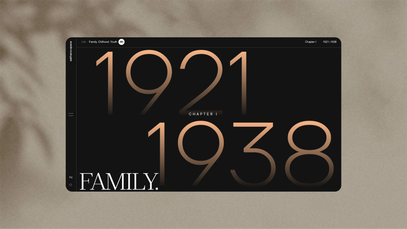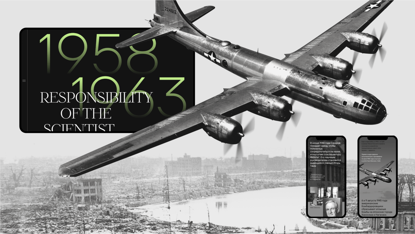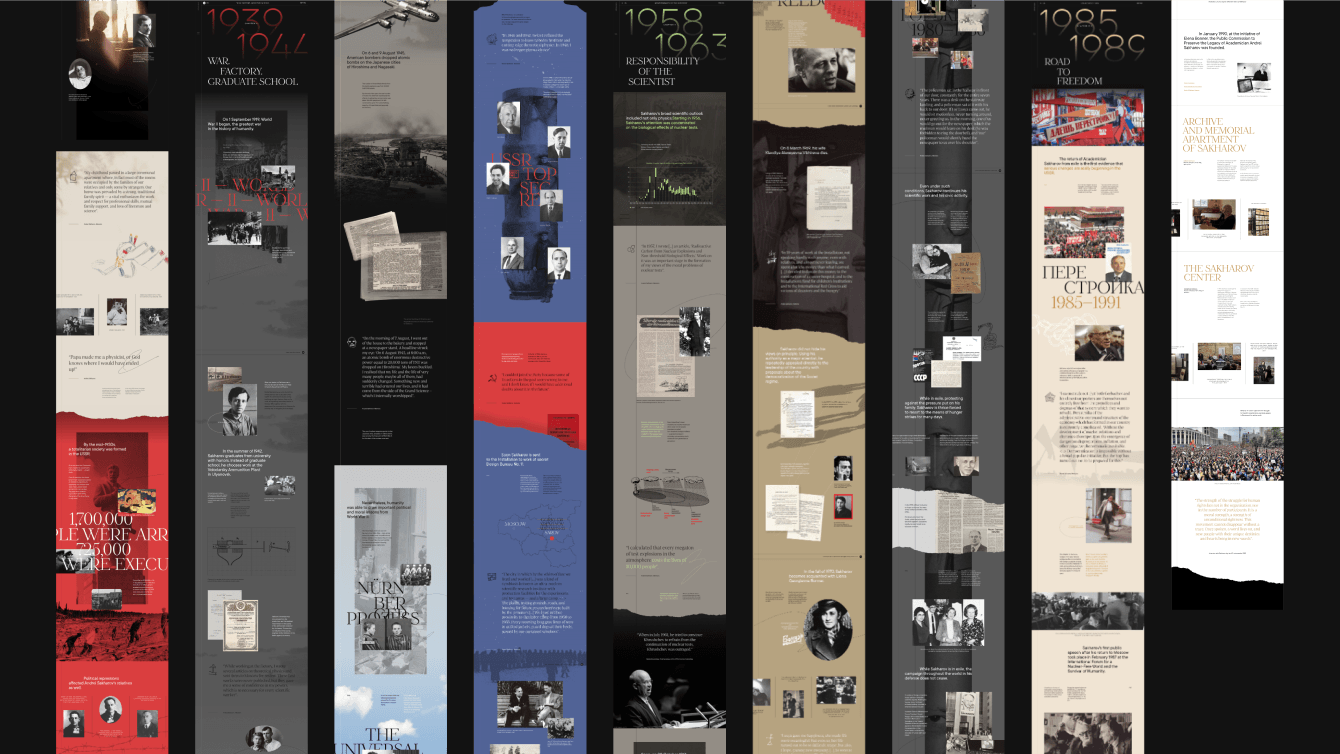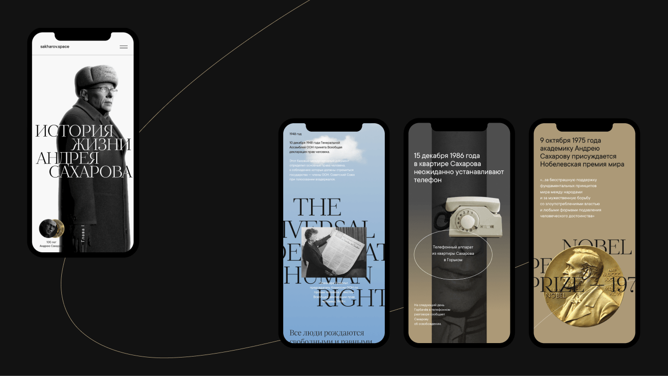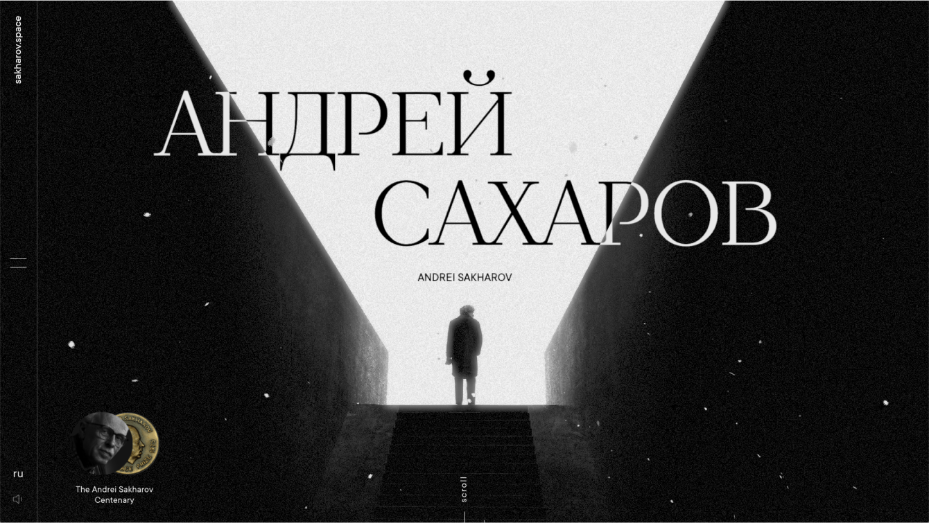 Проект посвящён великому гуманисту и учёному, одному из создателей водородной бомбы, Андрею Дмитриевичу Сахарову. Во время работы над этим проектом мы прибегали к разным оригинальным решениям, одним из которых стало использование инструментов веба для создания экспозиции и введения зрителя во все этапы жизни героя, где главная метафора – это лестница. Всё это было направлено на то, чтобы зритель оставался вовлечённым и неравнодушным в течение всего просмотра, и нам удалось добиться этого эффекта.