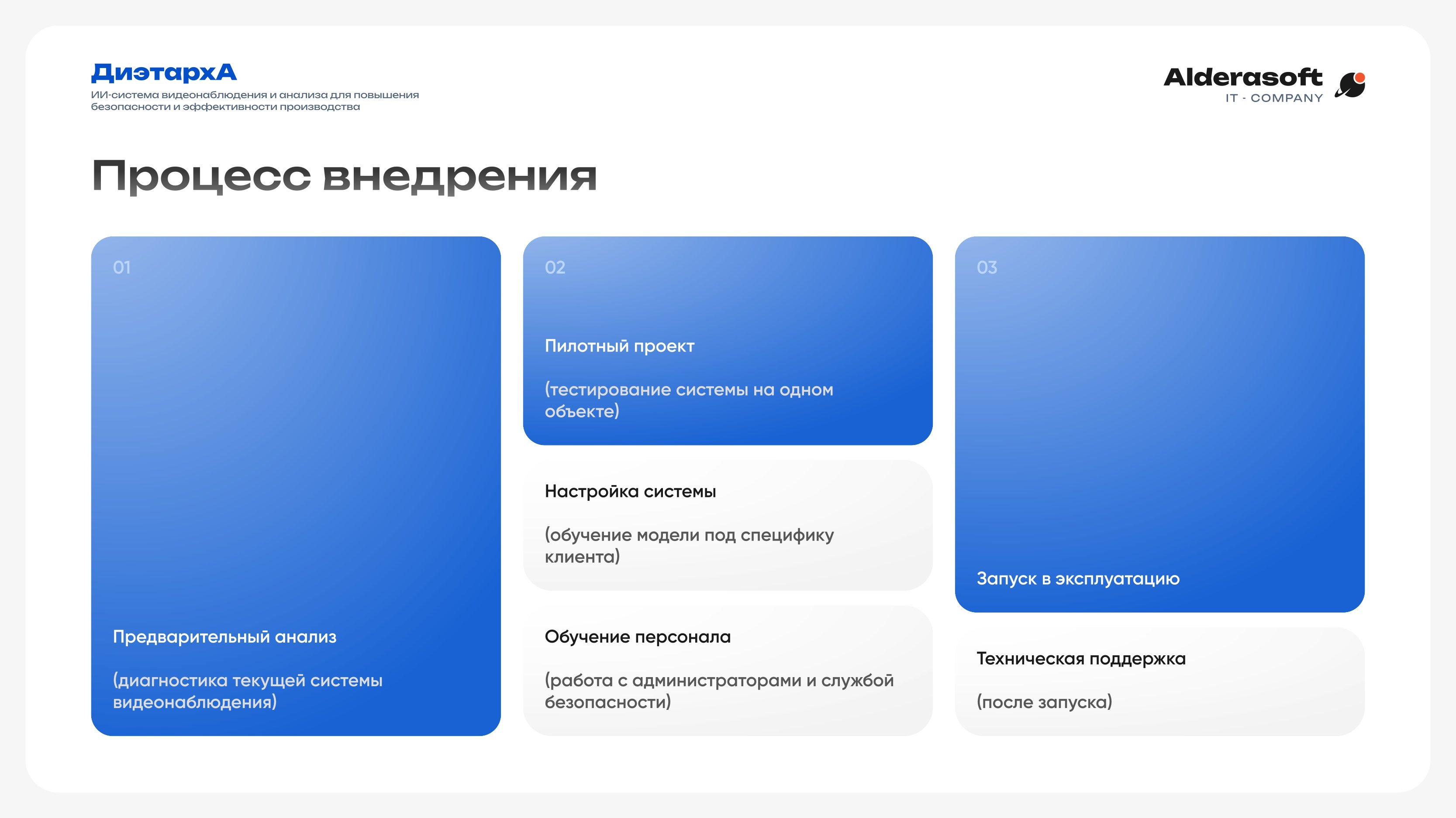 Мы предложили разработку и внедрение системы видеоаналитики «ДиэтархА», адаптированной под специфику предприятия. Процесс был разбит на несколько ключевых этапов, чтобы гарантировать результат: