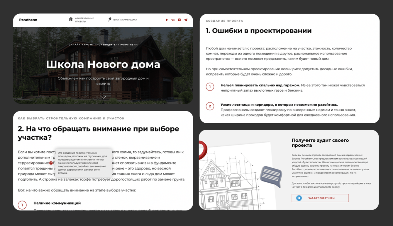 За несколько лет регулярной работы мы вместе с маркетингом Porotherm смогли построить экосистему digital-инструментов, которые работают на рост знания бренда для разных сегментов целевой аудитории.