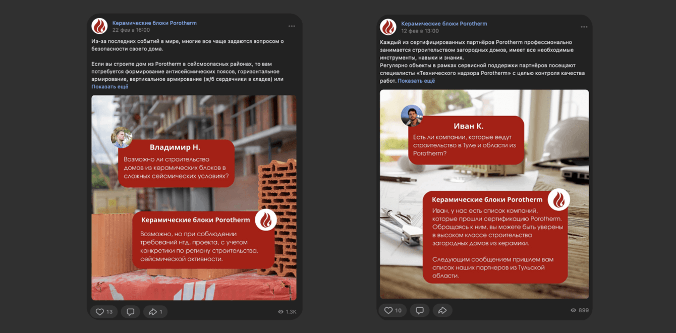 ➡️ VK Клипы. Поскольку у Porotherm своя внушительная база видеоконтента, мы используем его для развития сообщества Porotherm через VK Клипы и для развития других площадок через короткие форматы видео. Например, еженедельно мы ведем рубрику «Технический надзор», где в формате минутного клипа разбираем ошибки с реальных строек.