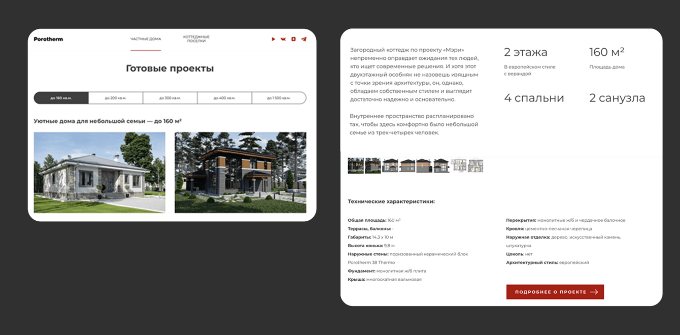 Основная задача проекта — наглядно показать, что дома из керамических блоков могут быть разными по стилю и подходить под разные финансовые возможности. По сути, сайт стал агрегатором проектов от сертифицированных строительных компаний, с которыми можно надежно построить качественный дом из Porotherm. Мы разбили проекты на категории по площади готового дома, для каждого сделали описание и перечень основных характеристик: материалы, стиль, площади отдельных зон.