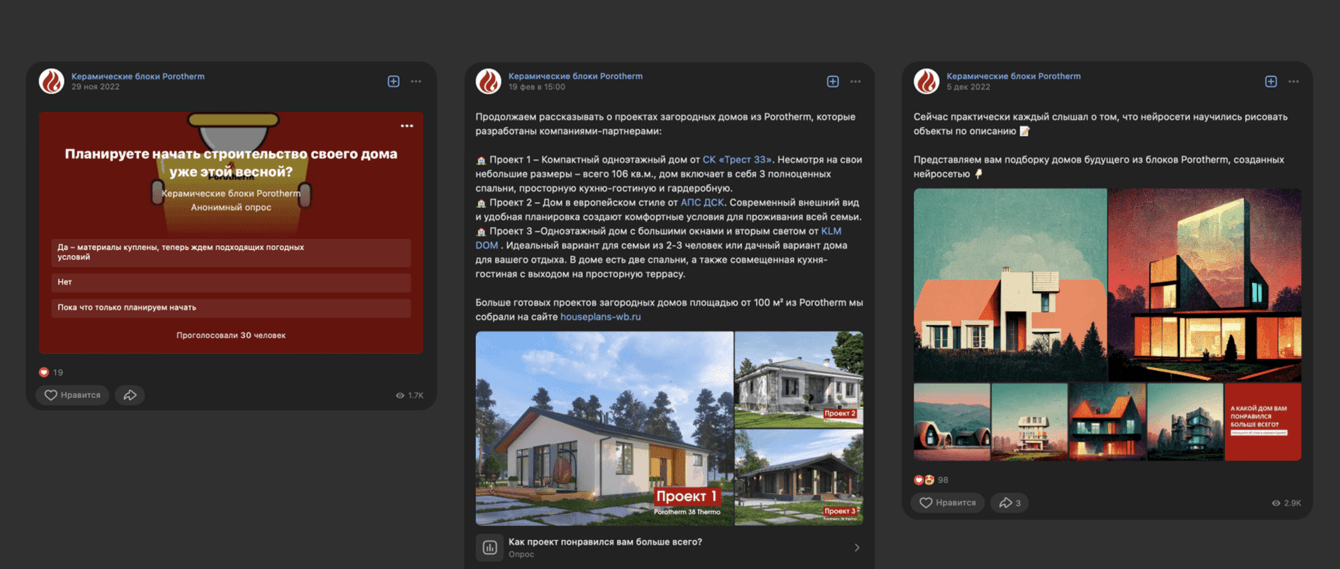 Экспертный контент на сложные строительные темы сложно вместить в короткие форматы, привычные для целевой аудитории бренда в социальных сетях. Поэтому в работе с Porotherm задача социальных сетей — сформировать лояльное коммьюнити пользователей через вовлеченность в контент и регулярное общение.