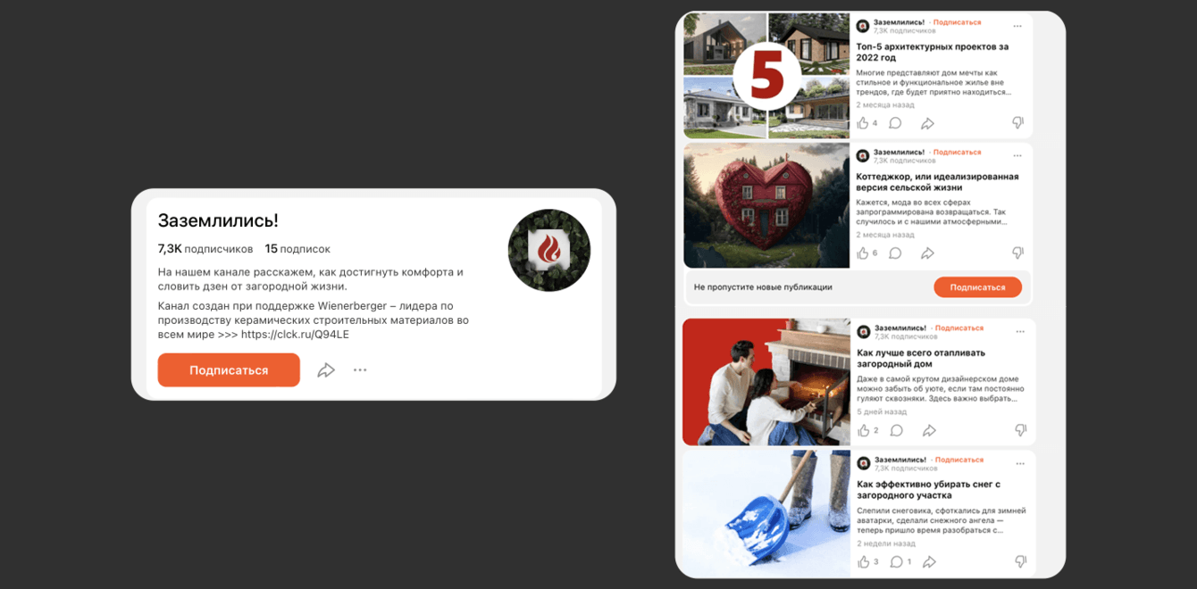 Блог в Дзене — актив, который работает с B2C-аудиторией. В нем мы стараемся сохранять баланс между бренд-контентом и вдохновляющим и полезным контентом о загородной жизни.