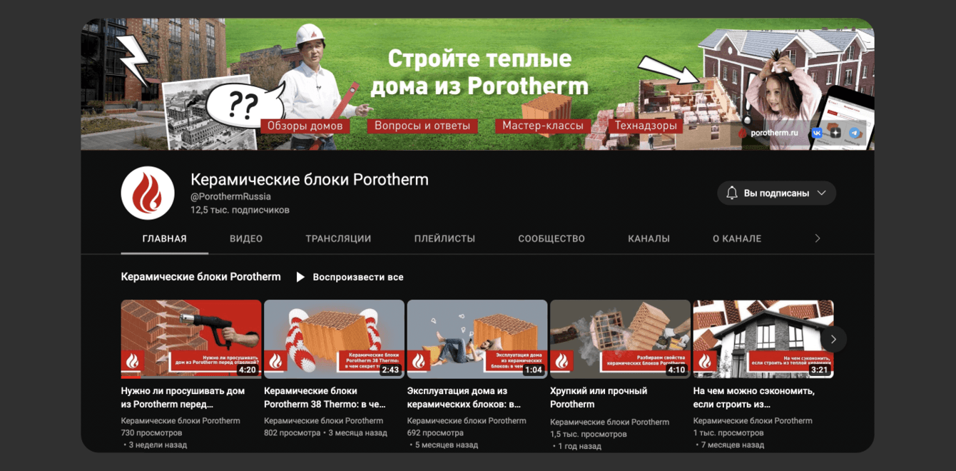 Вместе с Porotherm мы активно развиваем канал с 2019 года. Видео — отличный формат контента для обеих групп аудиторий: и для B2C, и для B2B.