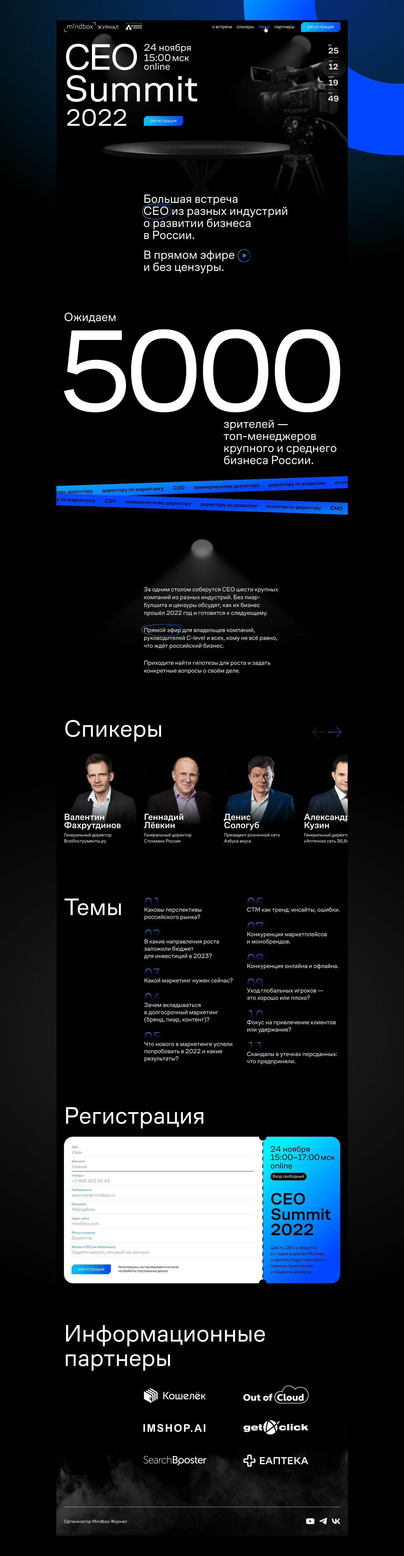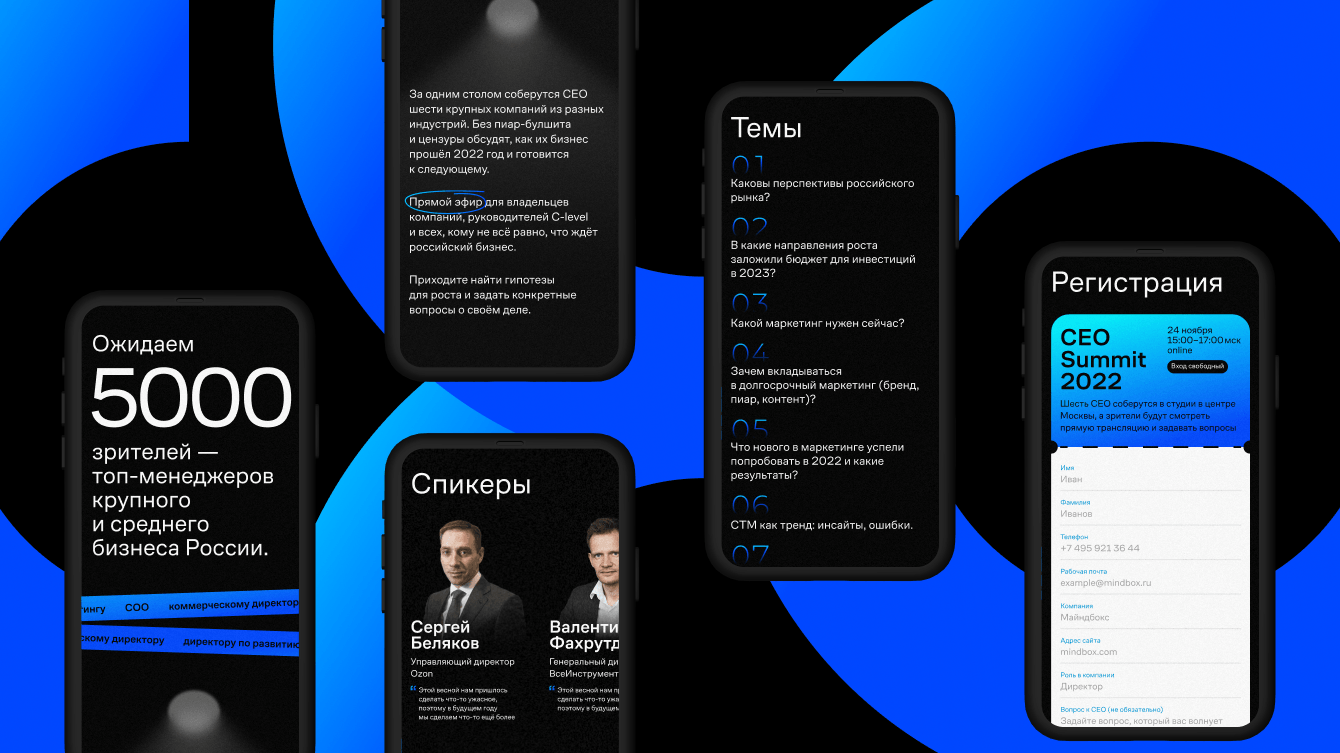 Задача была в том, чтобы лендинг CEO Summit отличался от основного брендбука Mindbox. Поэтому мы разрабатывали не только дизайн сайта, но и фирменный стиль всего ивента.