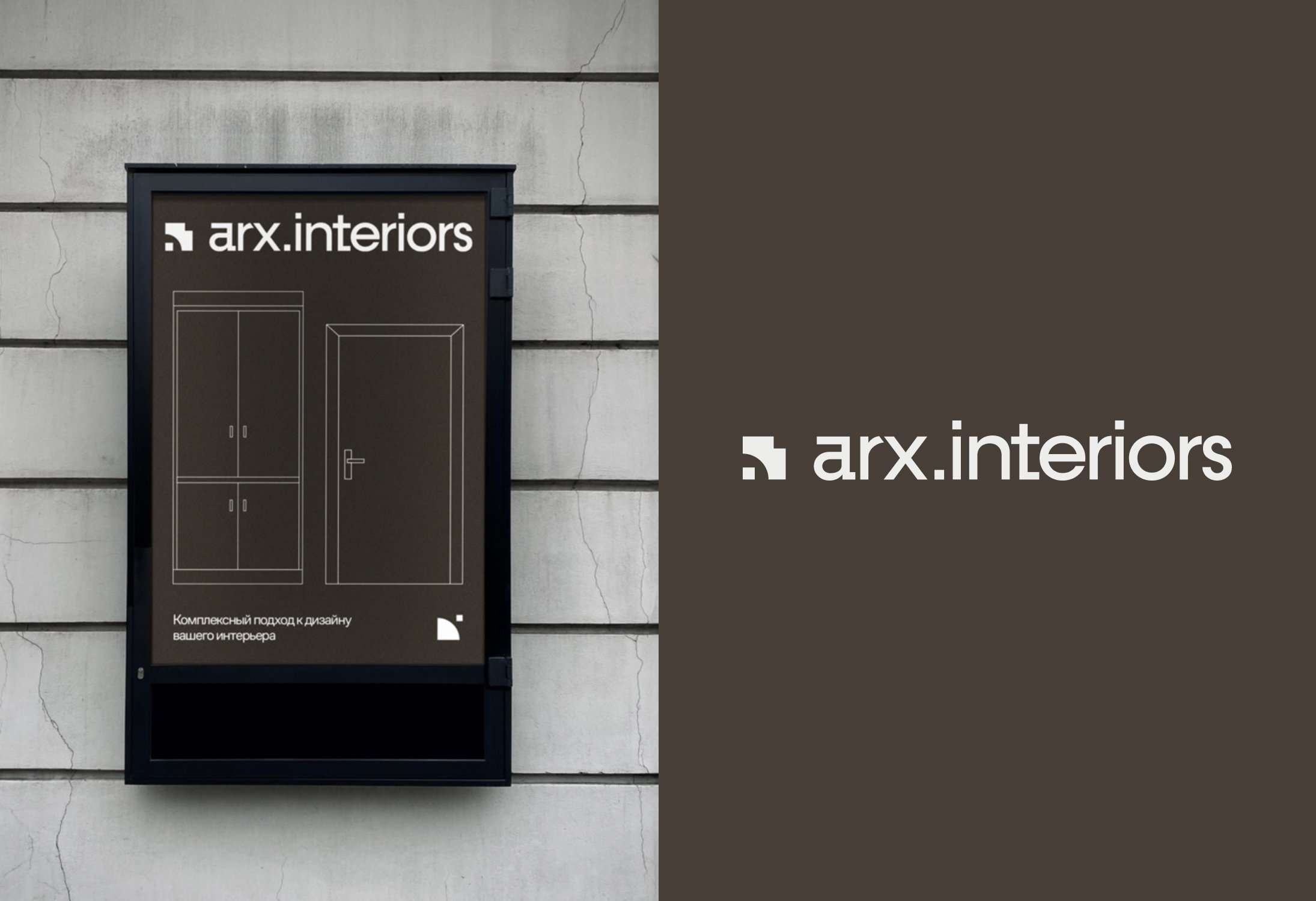 Arx.Interiors, связанный с дизайном жилых и общественных пространств, оформлен в тёплых натуральных оттенках — коричневом и бежевом, передающих атмосферу уюта и эстетики минимализма.