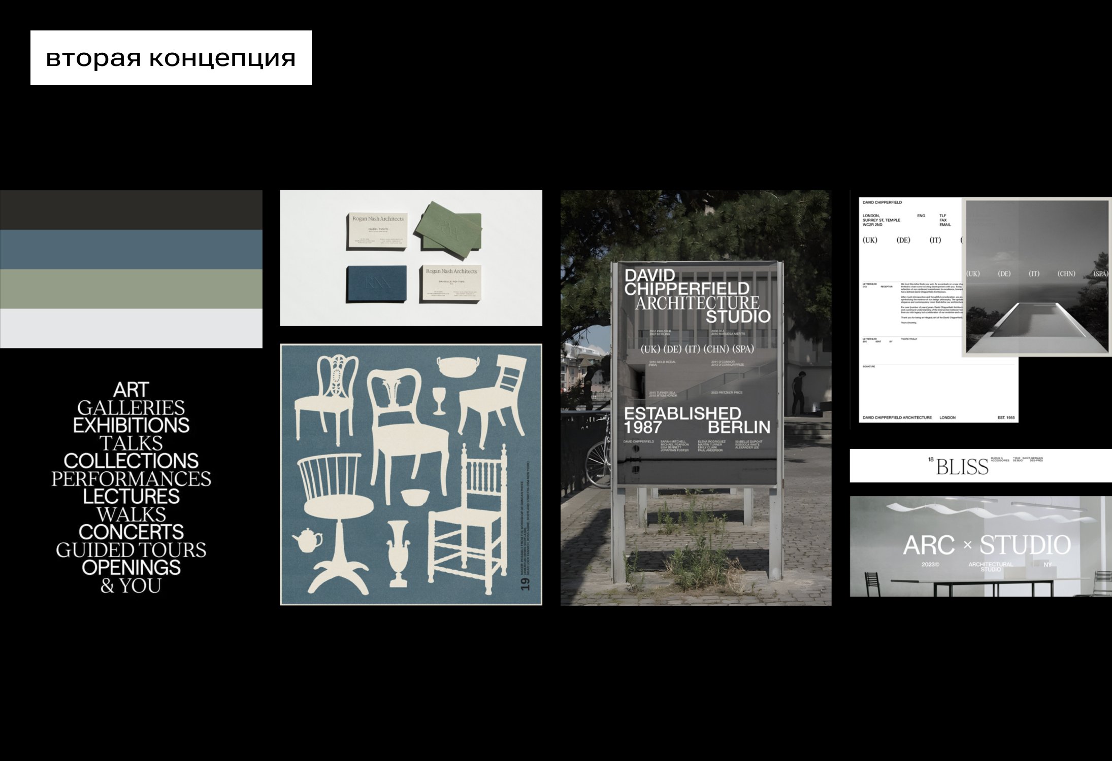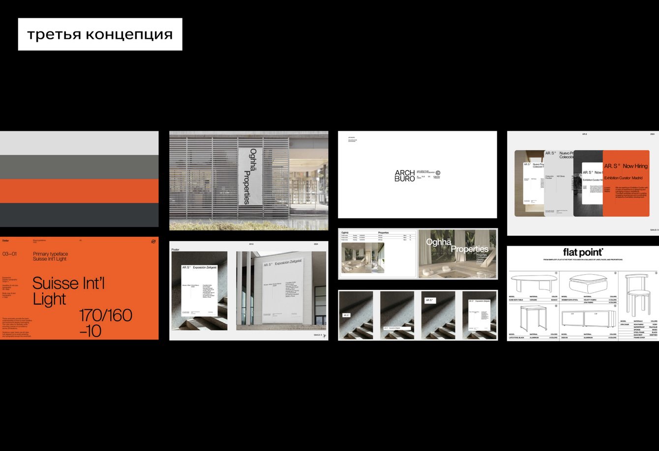 Третья концепция задаёт строгий и брутальный настрой швейцарским стилем — чёткой типографикой, продуманной сеткой и современными лаконичными шрифтами. Она позиционирует компанию как агентство с безупречными процессами и проектами высокого уровня. Цветовая палитра включает яркие акцентные тона, а гибкость обеспечивается системой дескрипторов, вариативной палитрой и строгими линейными иллюстрациями.