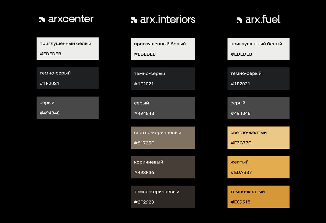 В нем собраны основные, краткие, шрифтовые и кириллические версии логотипа, описаны охранные поля, цветовые вариации и недопустимые приёмы. Каждое направление — основной бренд, arx.interiors и arx.fuel — имеет собственную цветовую палитру, подчёркивающую характер деятельности, но сохраняющую связь с общей системой.