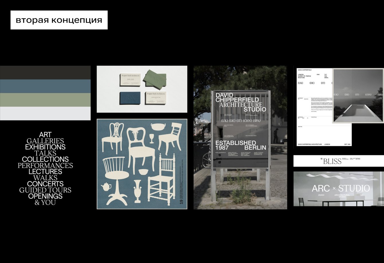 Вторая концепция более элегантная и утончённая благодаря антиквенным шрифтам и сложной сетке, но при этом она остаётся минималистичной и современной. Природная палитра создаёт ощущение натуральности. Система масштабируется на два направления через версии логотипа, гибкие цвета и графику — монохромные иллюстрации с детализацией и ломаными краями под творческий характер бренда.